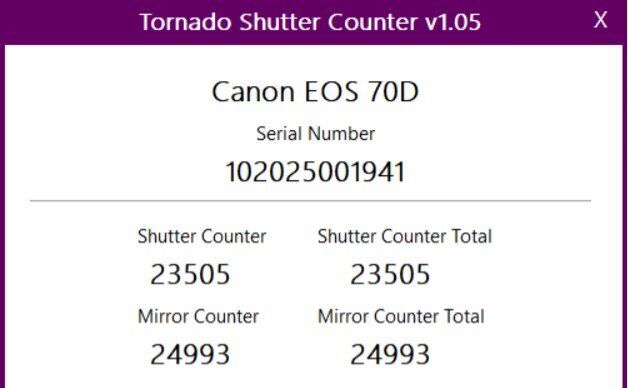 I checked the shutter count with Tornado Shutter Counter. The shutter counter total is 23,505 and the mirror counter total is 24,993.