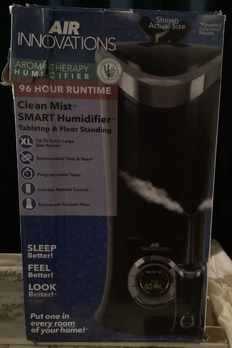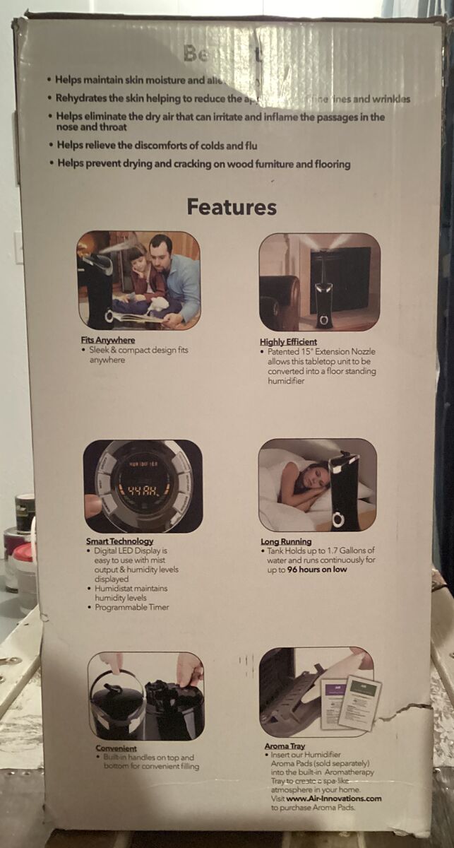 Purchased as a backup but never needed. Black, with a remote control and aromatherapy capability. We use an identical unit in our great room at full mist for 2 days before it needs more water. Silent, with adjustable mist volume and direction, and adjustable height. Air Innovations brand. Located in Riverton, UT.