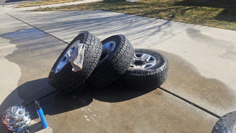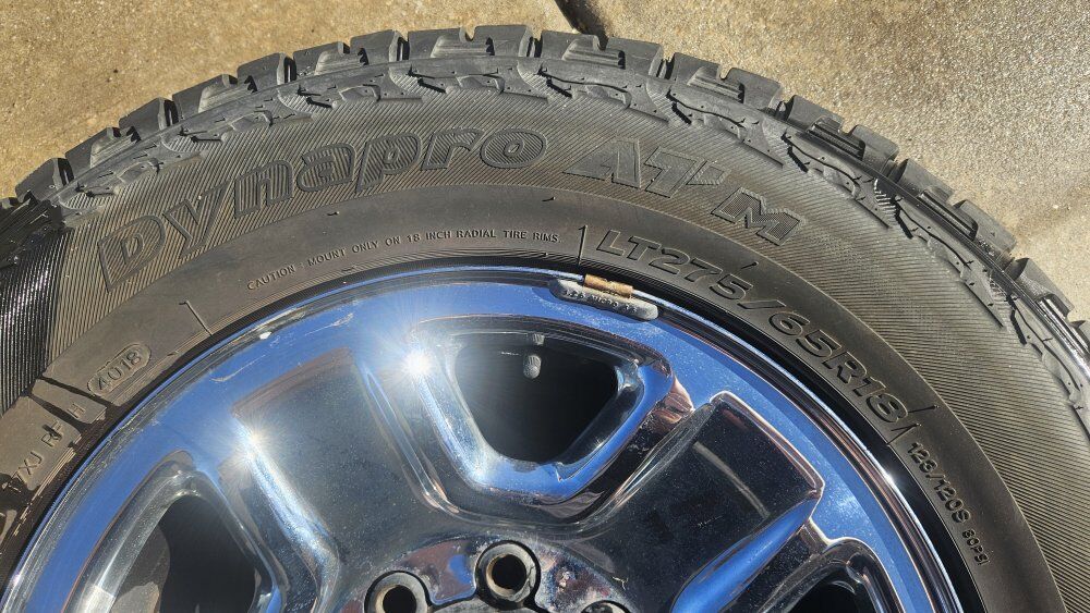 VenmoI've got a set of Ram stock wheels from my 2018, I have all the center caps and lug nuts for them. Tires aren't brand new but have plenty of tread life left. Tires are Dynapro AT/M's size LT275/65R18. One does have a screw in it but holds air, its in the center of the tread so any shop shouldn't have a problem plugging it.