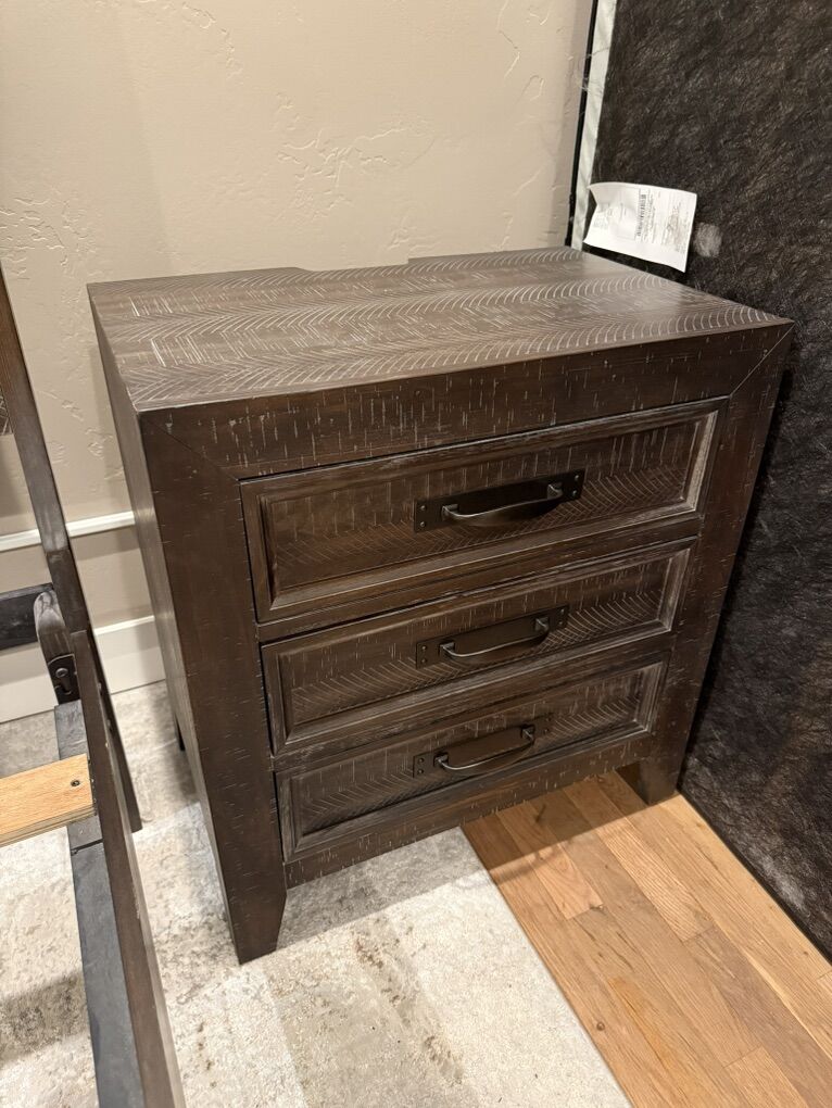 ZelleQueen bed frame (sleigh bed) Two 3-drawer bedside tables, with electric plugs 9-drawer dresser with mirror