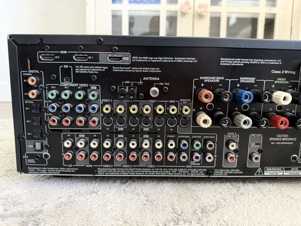 -90 watts x 7 into 8 ohms (20-20,000 Hz) at 0.08% THD -Dolby® Digital EX, DTS-ES®, Pro Logic® IIx, and DTS Neo:6 decoding -1080p-compatible HDMI switching (2 in, 1 out) HDMI version 1.1 -XM Satellite Radio Ready (requires XM subscription and optional XM Mini-Tuner package) -Neural Surround™ decoder for XM's HD Surround channels -dual-room/dual-source audio (powered and fixed line-level stereo audio output for 2nd room; using powered 2nd-room output allows 5.1 home theater in main room) -component video conversion -192kHz/24-bit DACs for all channels multibrand remote -component video switching: 3 in, 1 out (50MHz bandwidth) -digital inputs: 4 optical (including 1 front-panel), 2 coaxial -optical digital output -7.1-channel analog audio preamp input -5 audio/video (including 5 S-video and 1 front-panel) inputs -2 audio inputs -on-screen display (requires TV with direct video input) -40 AM/FM/XM presets -Wide Range Amplifier Technology aluminum front panel -oversized power transformer, filter capacitors and heat sinks -1 pair of main speaker outputs -sleep timer -17-1/8W x 6-7/8H x 15-1/2D