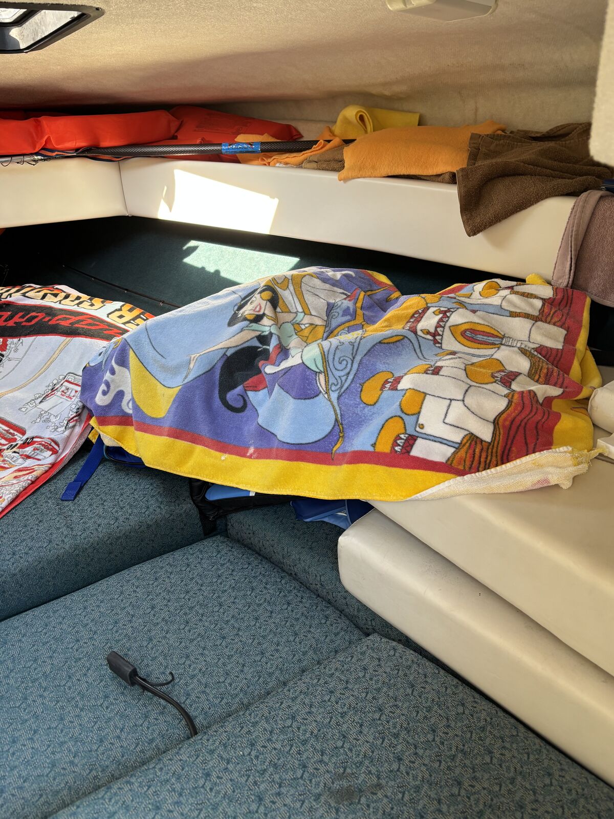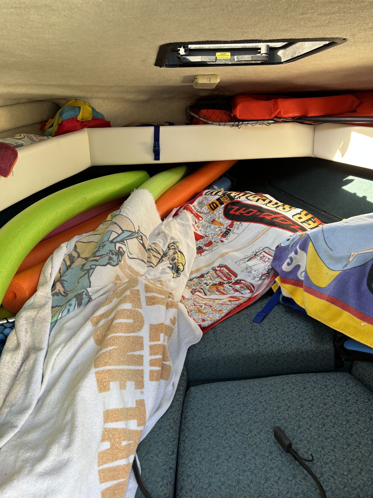 Comes with 8 life jackets, ropes, buoys, 2 rider towable tube, pool noodles, paddle, and boat hook.