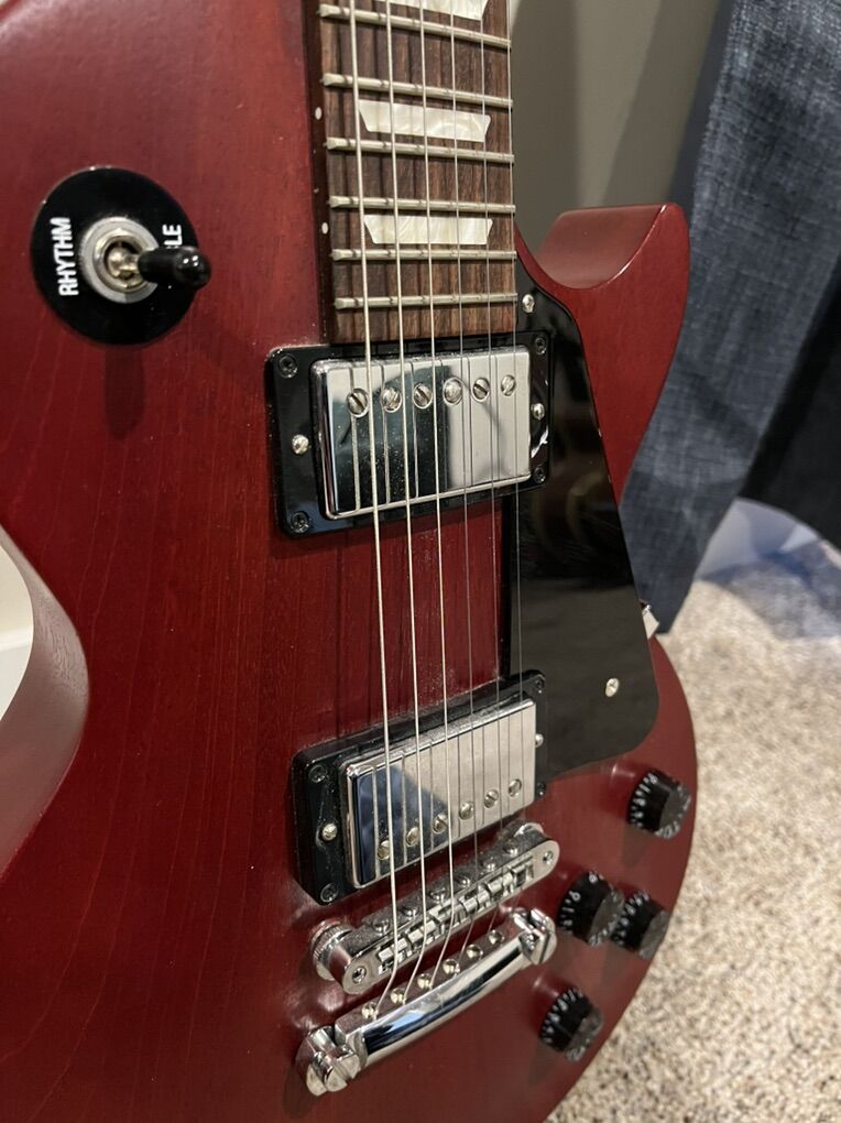 VenmoWorn cherry Mahogany body with solid carved maple top Solid-mahogany neck, ’50s profile that measures .818” at the 1st fret and .963” at the 12th 22-fret fingerboard made from hard, brown baked maple, a wood selected for its sustain and bite Traditional acrylic trapezoid inlays Burstbucker Pros on this guitar give you all the renowned warmth, growl and zing of genuine PAF humbuckers, with biting Alnico V magnets. The set includes a slightly overwound bridge pickup for searing lead tones, and both pickups feature wax-potted coils to squelch microphonic squeal at high volumes. Tune-o-matic bridge and stud-mounted wraparound tailpiece, along with a PLEK-cut Corian nut Vintage-style TonePros tuners Grab-and-go Gibson gigbag