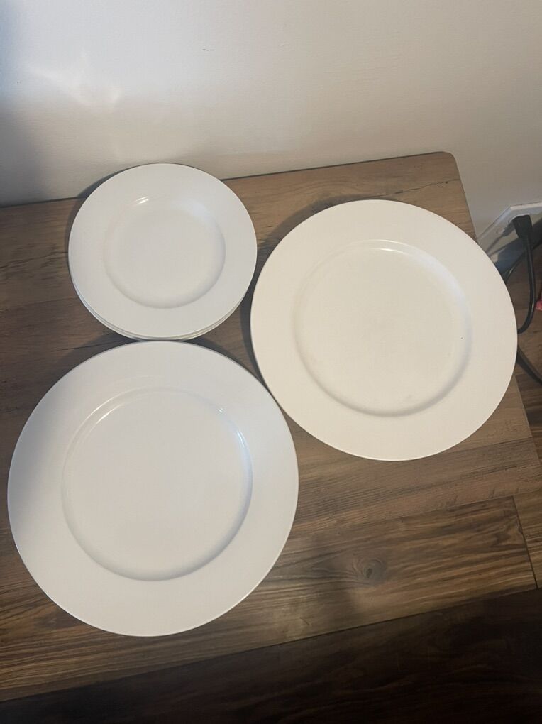 Set includes 4 small plates and 3 matching larger plates (same modern white design), plus 2 larger Pier 1 plates (different style). All in good used condition — no chips or cracks. Great for everyday use or extra dinnerware.