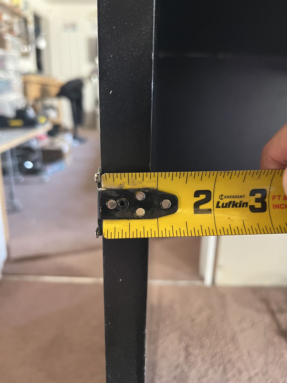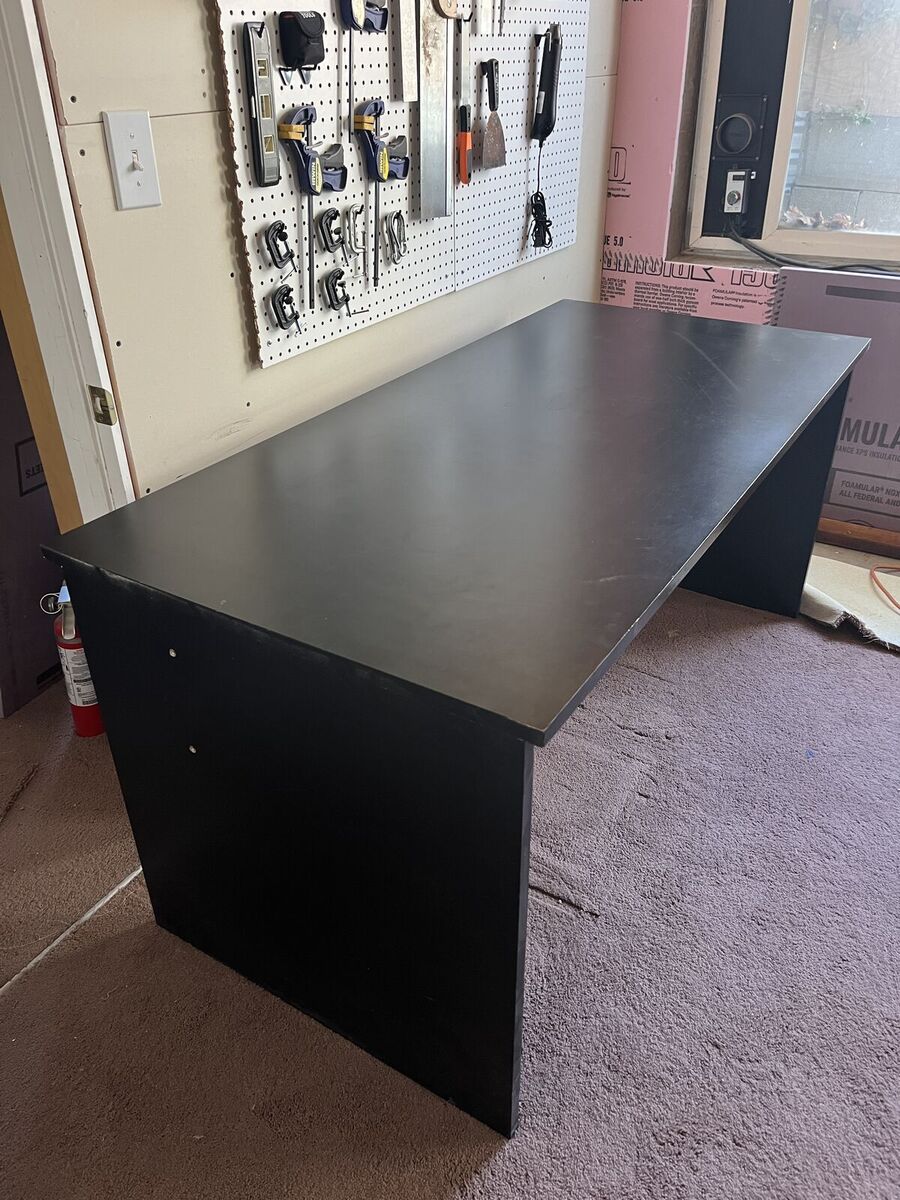 Large black desk in good condition. It is super easy to put together, just 4 screws and 4 cam locks. Edges show some wear and screw holes in the support beam where some cable management stuff was but it's not visible from above. Top surface has no major gouges, marks, or cuts.