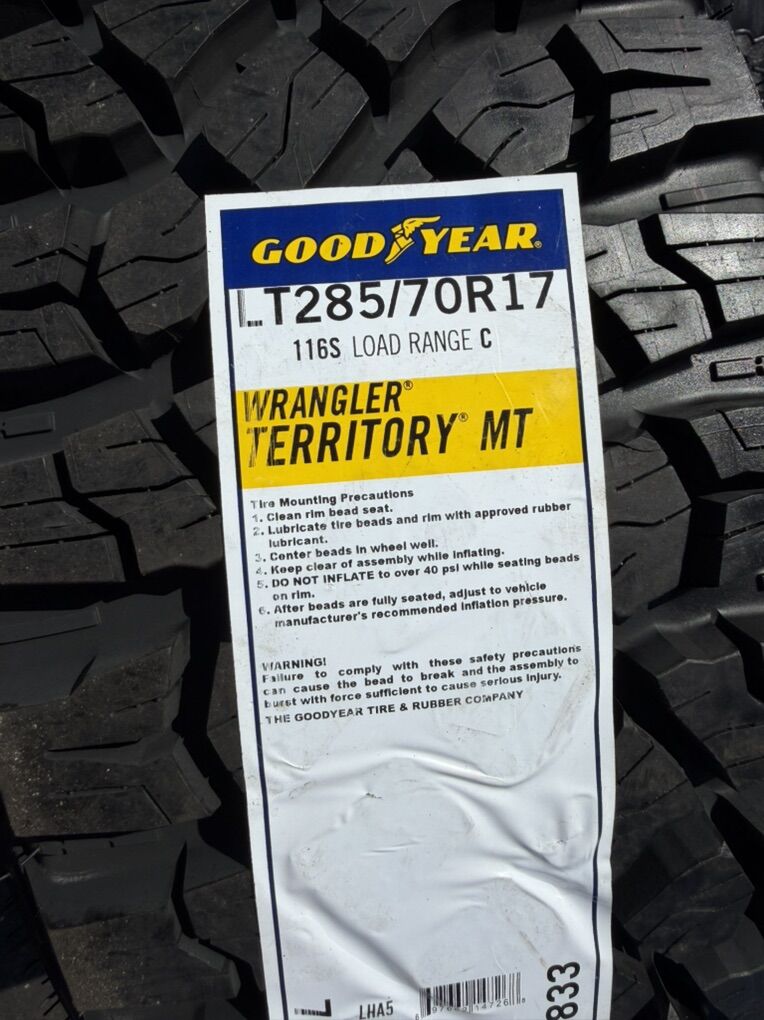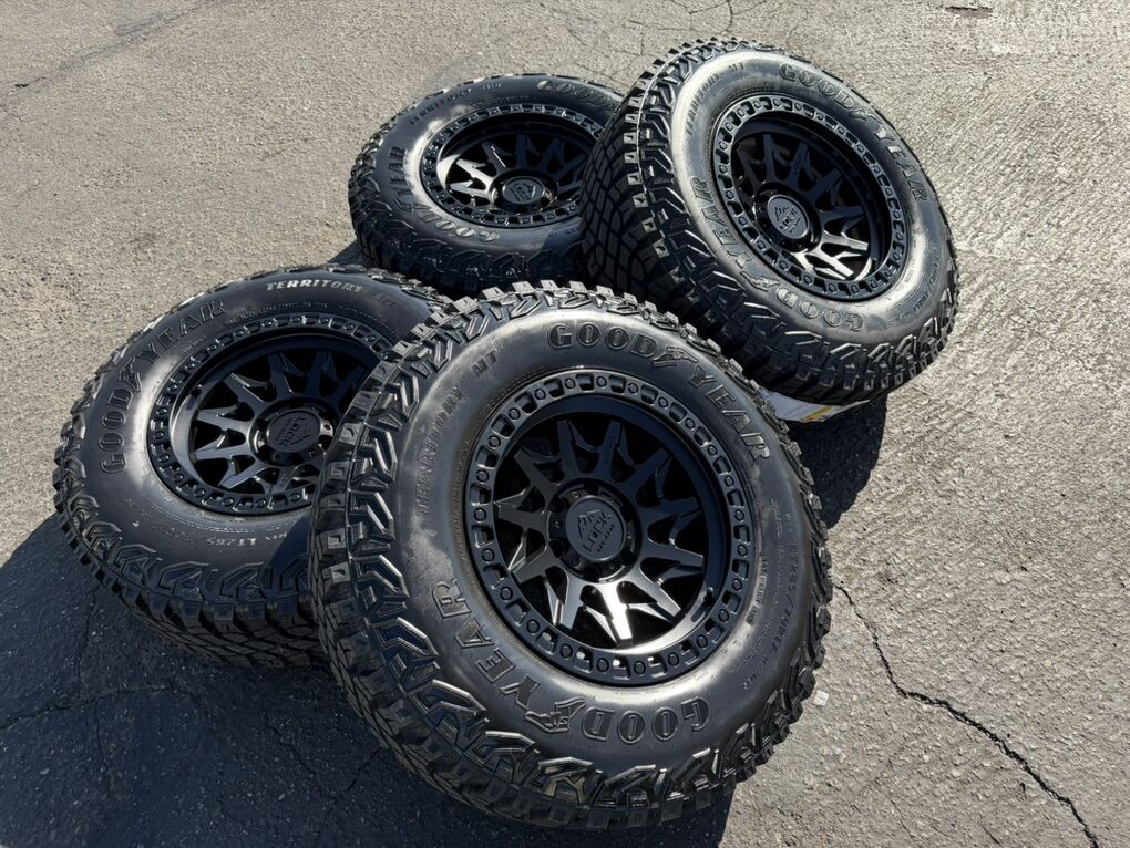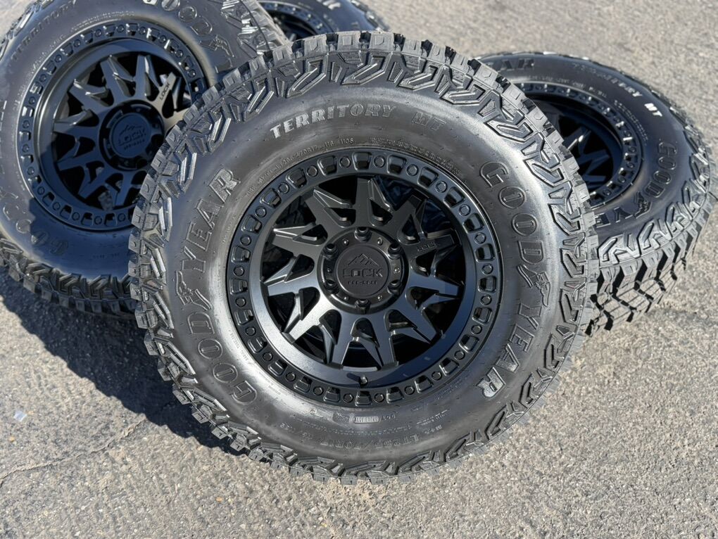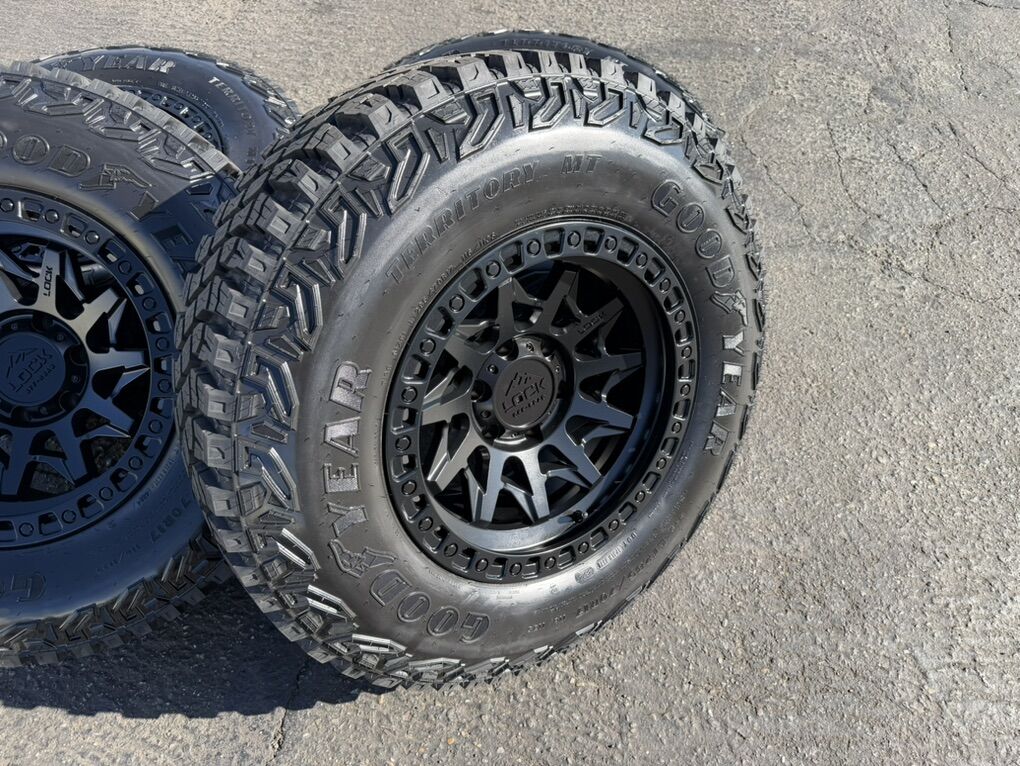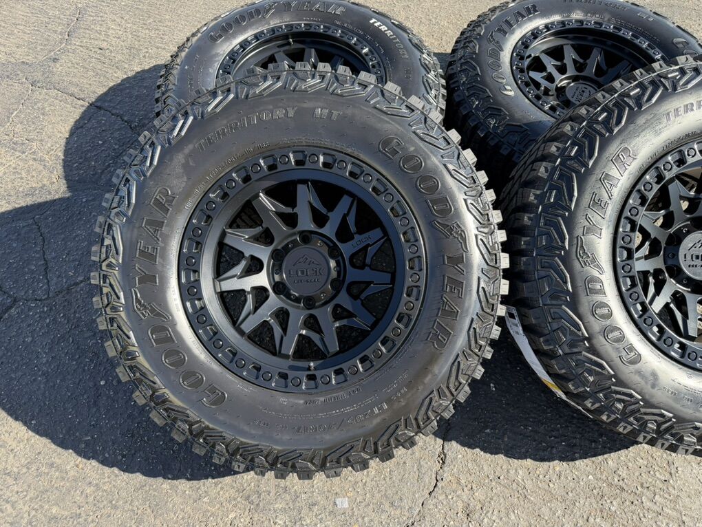 ApplePayBrand new package! On special! 17x9 -12et offset Lock Lunatic wheels Black finish mounted and balanced on 285/70r17 Goodyear Territory MT tires. 6x5.5 bolt pattern (6x139.7). These fit Chevrolet Silverado 1500 GMC Sierra yukon tahoe Nissan Titan and Toyota Tacoma. HUGE Savings!