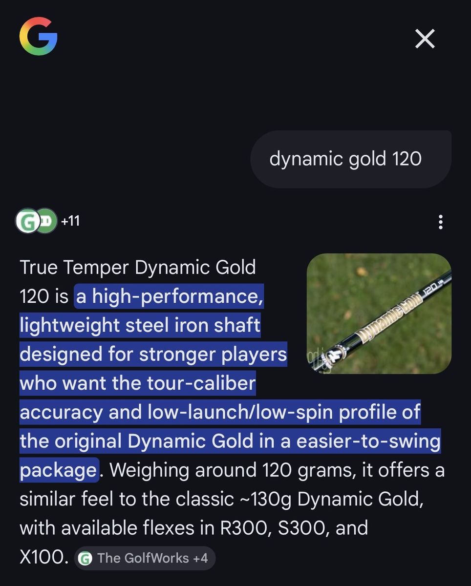 VenmoTrue Temper Dynamic Gold 120 X100 flex 7 shafts total, 5 iron through pw, gw Length as shown, which will play overlength at least a half inch pending hosel depth, so plenty of length to cut final length to whatever you need. I can trim for your heads if needed. Taper tip .355