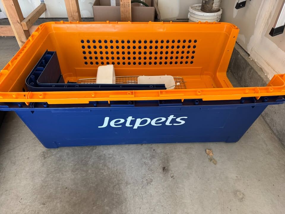 ZelleInternational travel approved P100 size or crate training large crate. Dis-assembled with water and food bowl. Strong gate for front access. Used for one international flight Aus/USA, supplied by Jetpets.