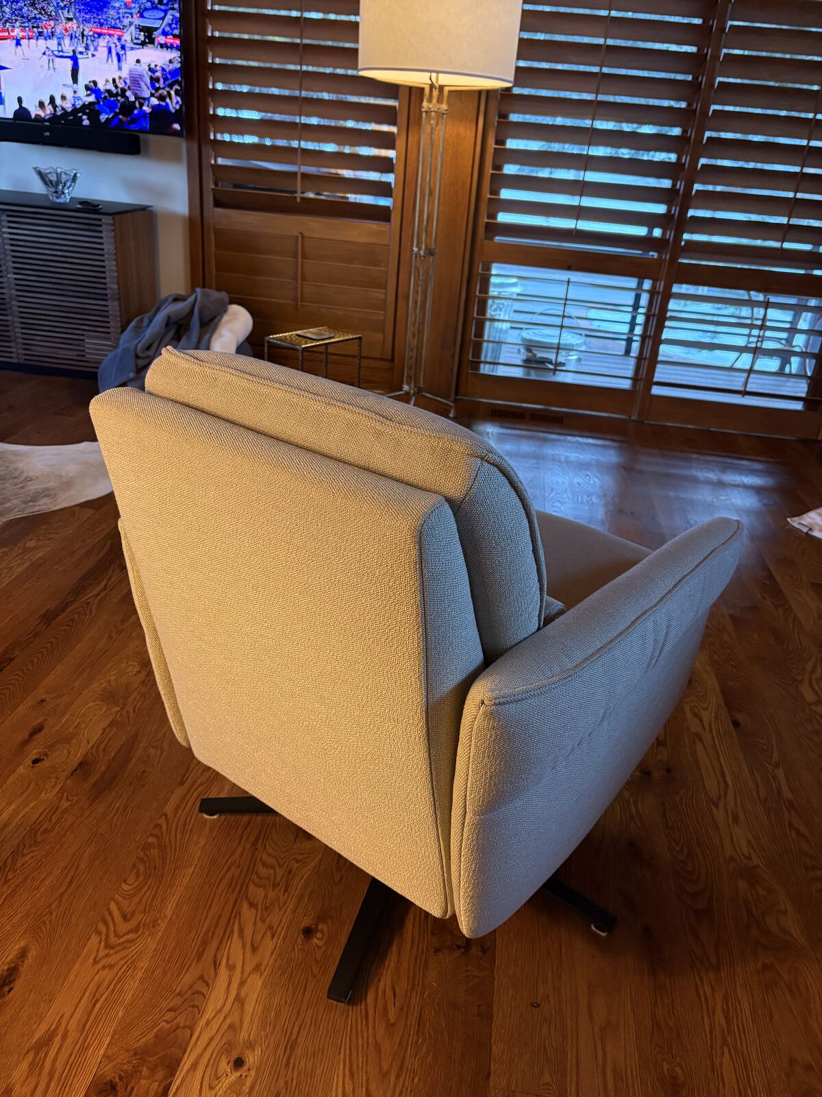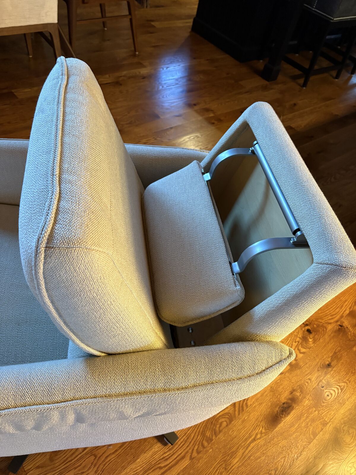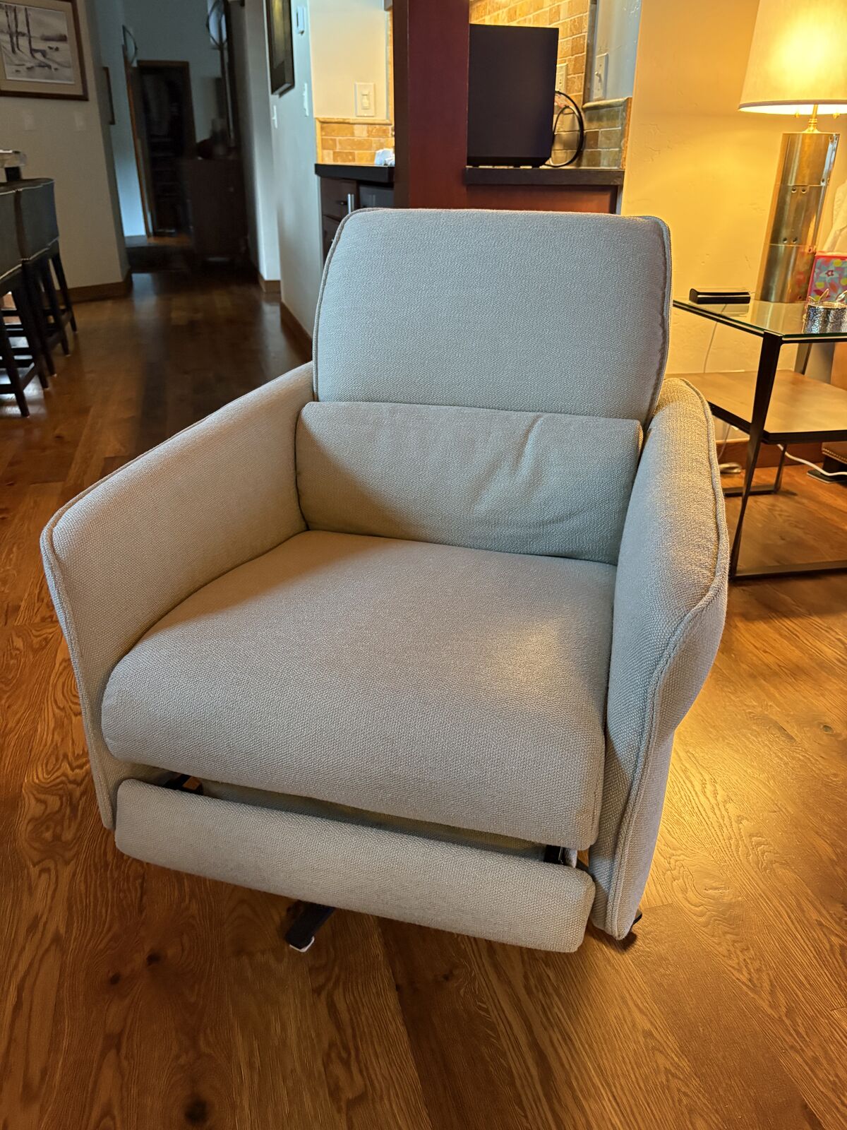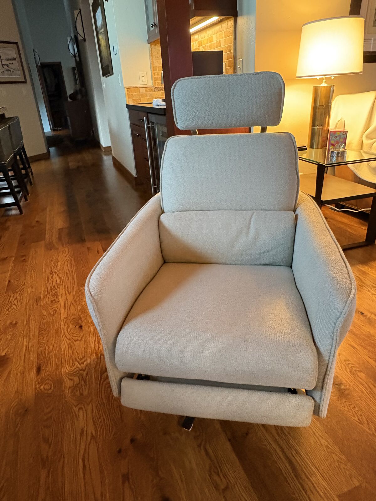 The AURA swivel, reclining armchair is a modest scale, extremely comfortable chair. Hidden headrest in back that can be folded out or left hidden. Integrated leg rest. See photos. Perfect for any space including smaller rooms.