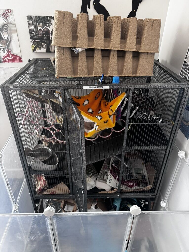 ZelleHello! The last of my boys passed recently and I am looking to get rid of my set up. This comes with a number of hammocks (though they are very used), a cage, water bottles, storage bins, the remainder of the food I have (it is meant for adult rats) and play pen panels.