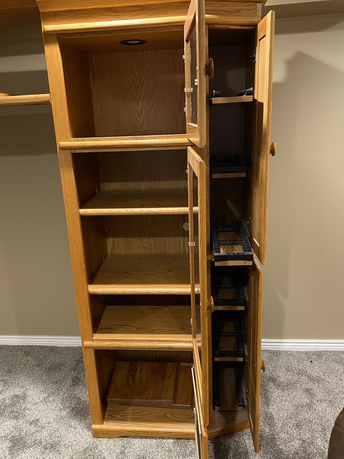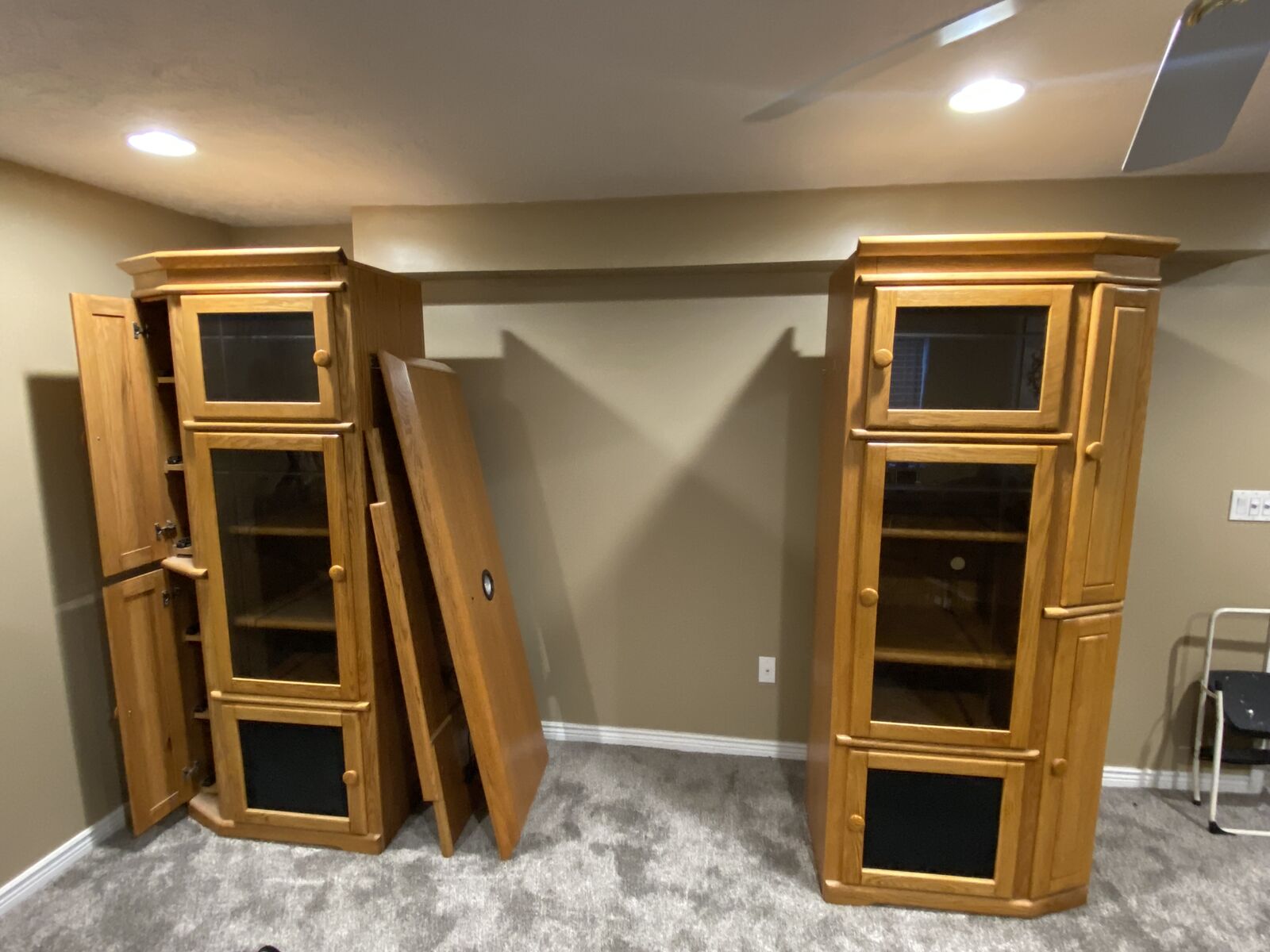 Free oak entertainment center with shelf, cabinets, and side shelving for VCR tapes. You must be able to pick it up. Bring help because it is heavy.