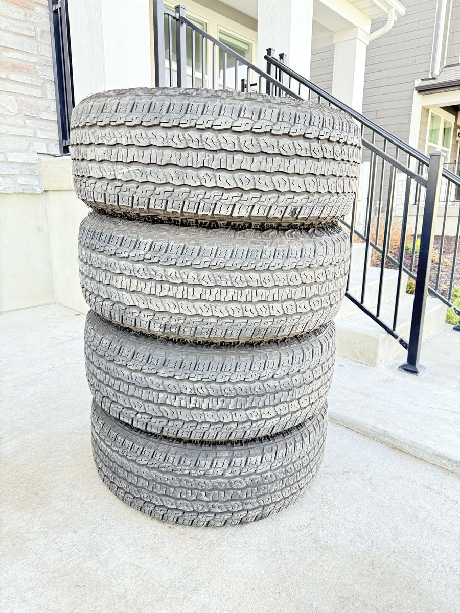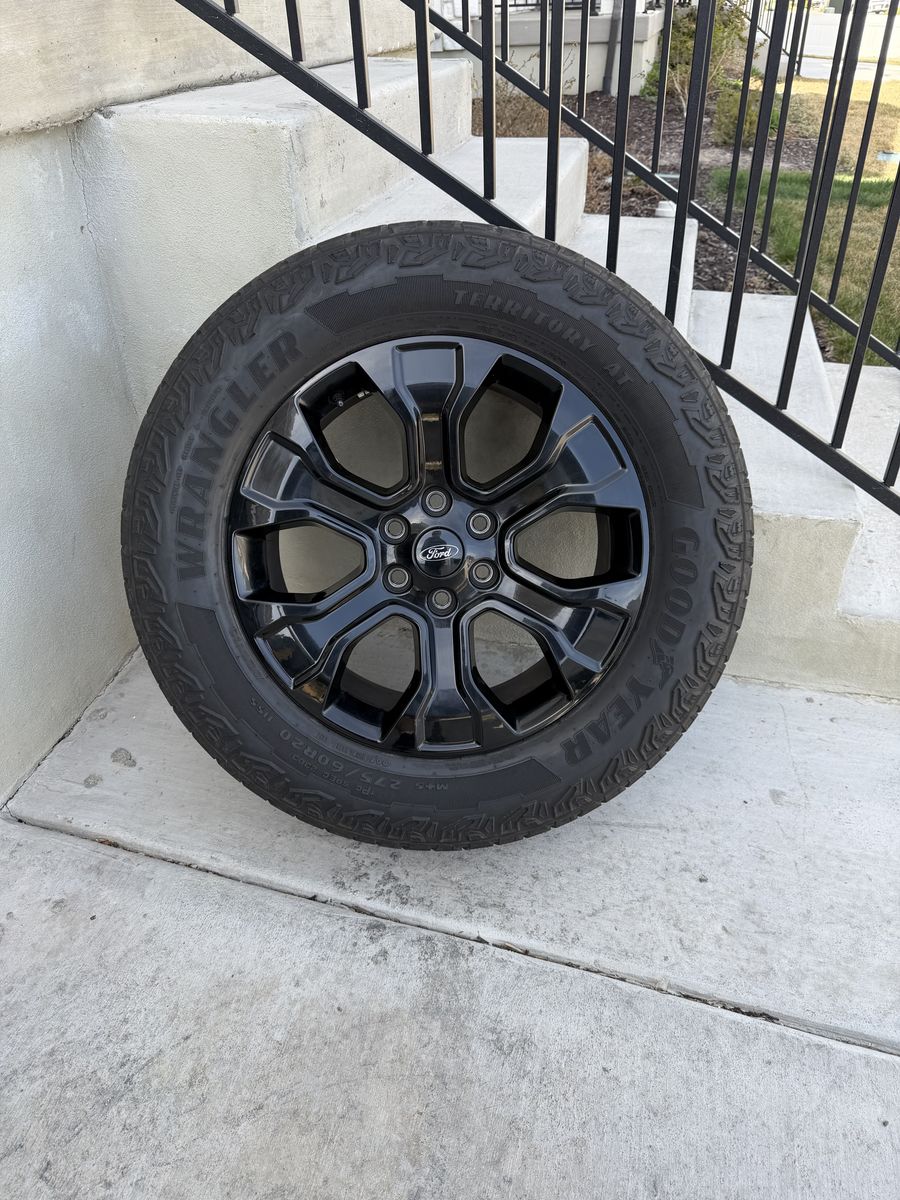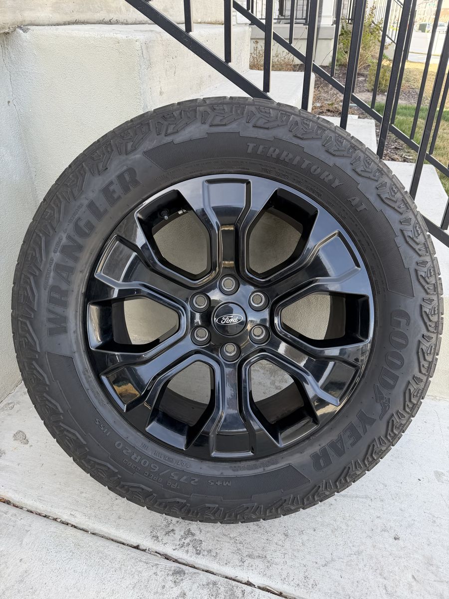 ApplePaySet of 4-Ford F150 Rims and Tires 275/60R20 Goodyear Wrangler Territory AT in great condition asking $1200 obo Tires have lots of tread left Rims are in great condition,1 rim has a curb not affecting anything Comes with 3 sensors,1 is missing Bolt pattern 6-135 Text anytime 385-402-2292