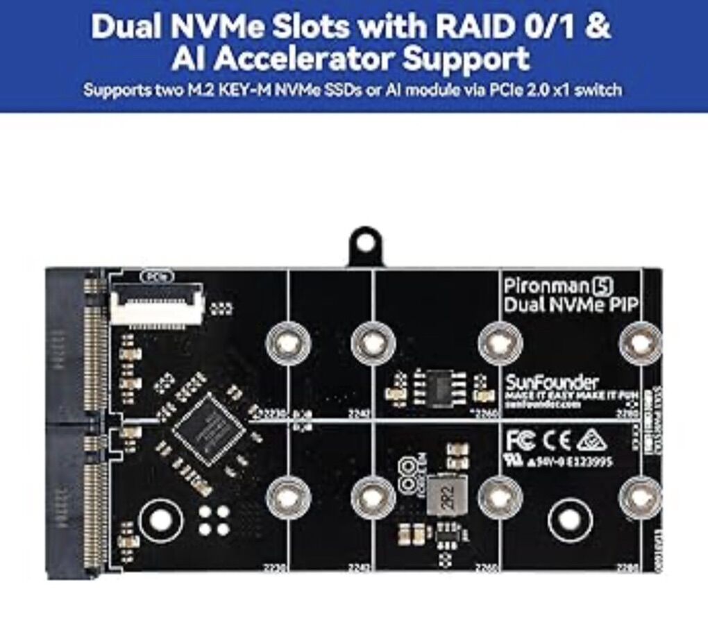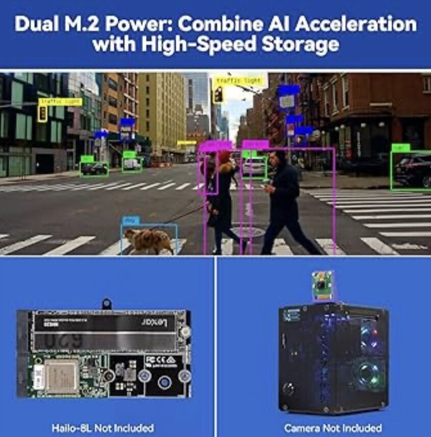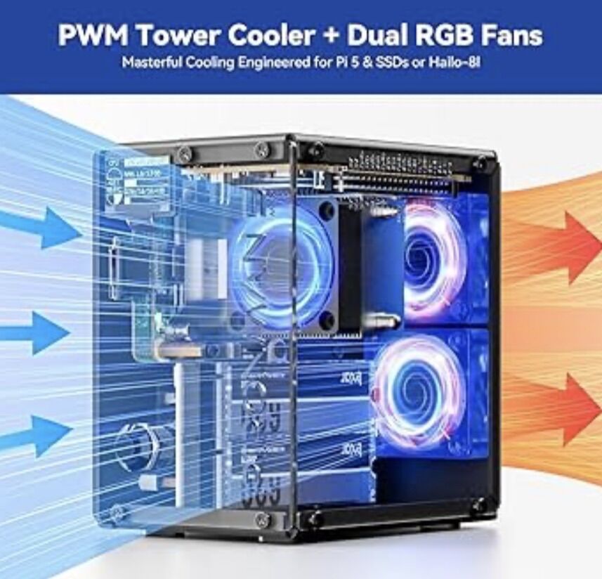 Raspberry pi 5 16gb, brand new. Comes with a heat tower, duel RGB gas with customizable LED lights, Oled screen display active info, a SD slot extender, duel NVME 2.0 slots supporting a wide range of sizes, compatible with hailo 8L ai accelerator chip, has own power button, GPIO pin extender, comparable with raspberry pi cameras, full custom desktop PC. Brand new, pre-assembled. Built in 2 HDMI ports. Comes with power cord,