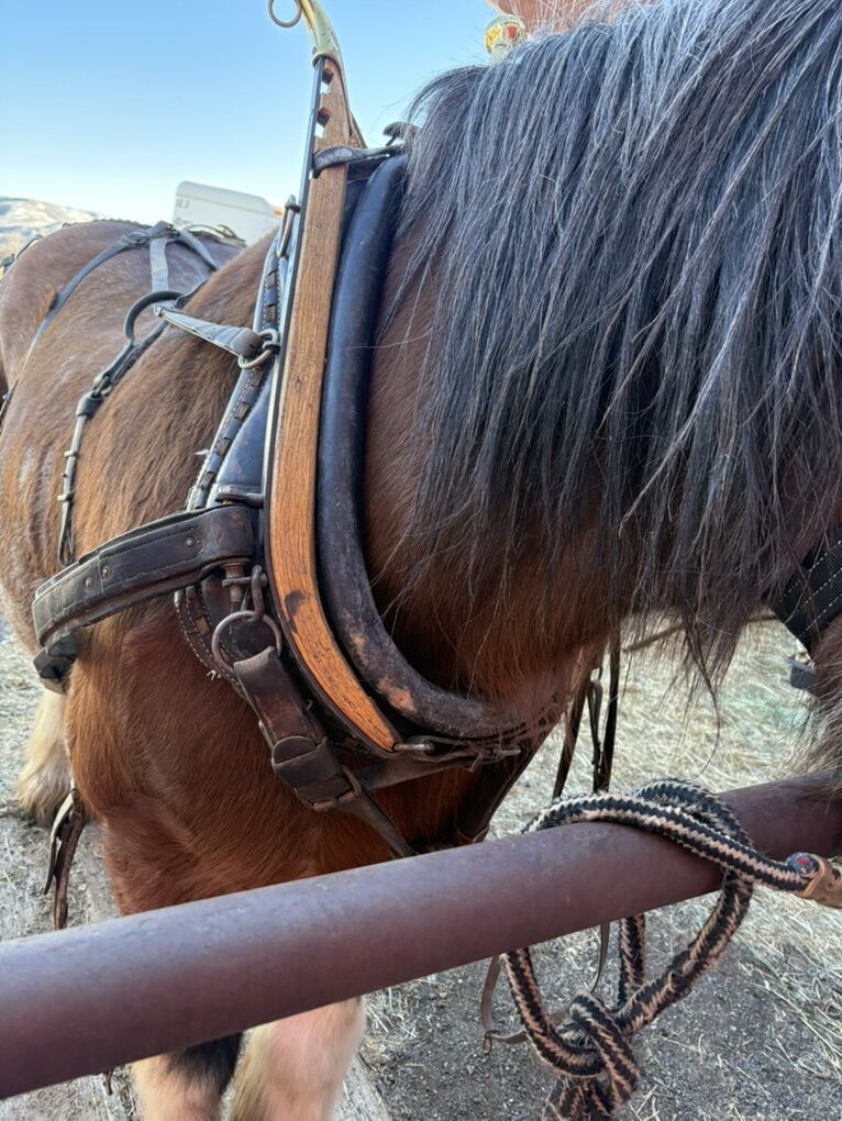 ZelleOlder leather draft harness for sale. Yankee breaching. Hames are beautiful and would make great western themed decoration.
