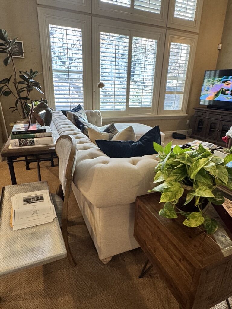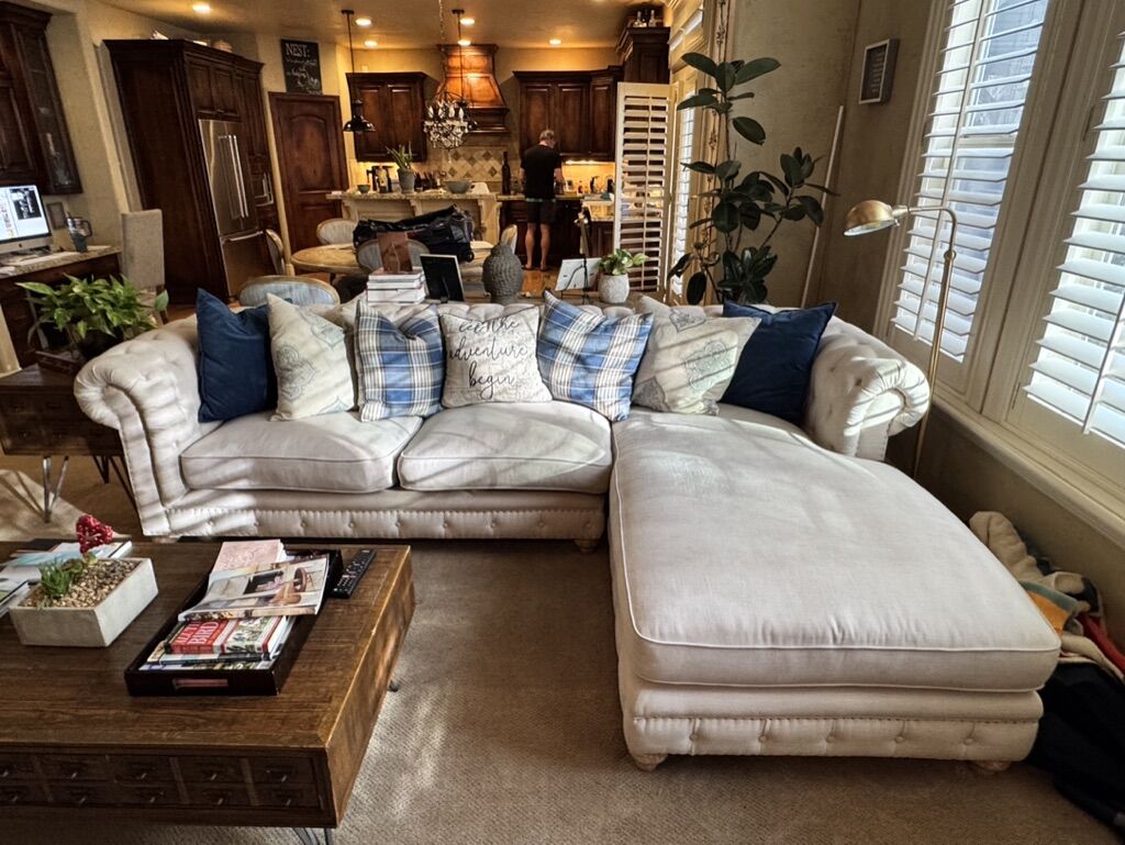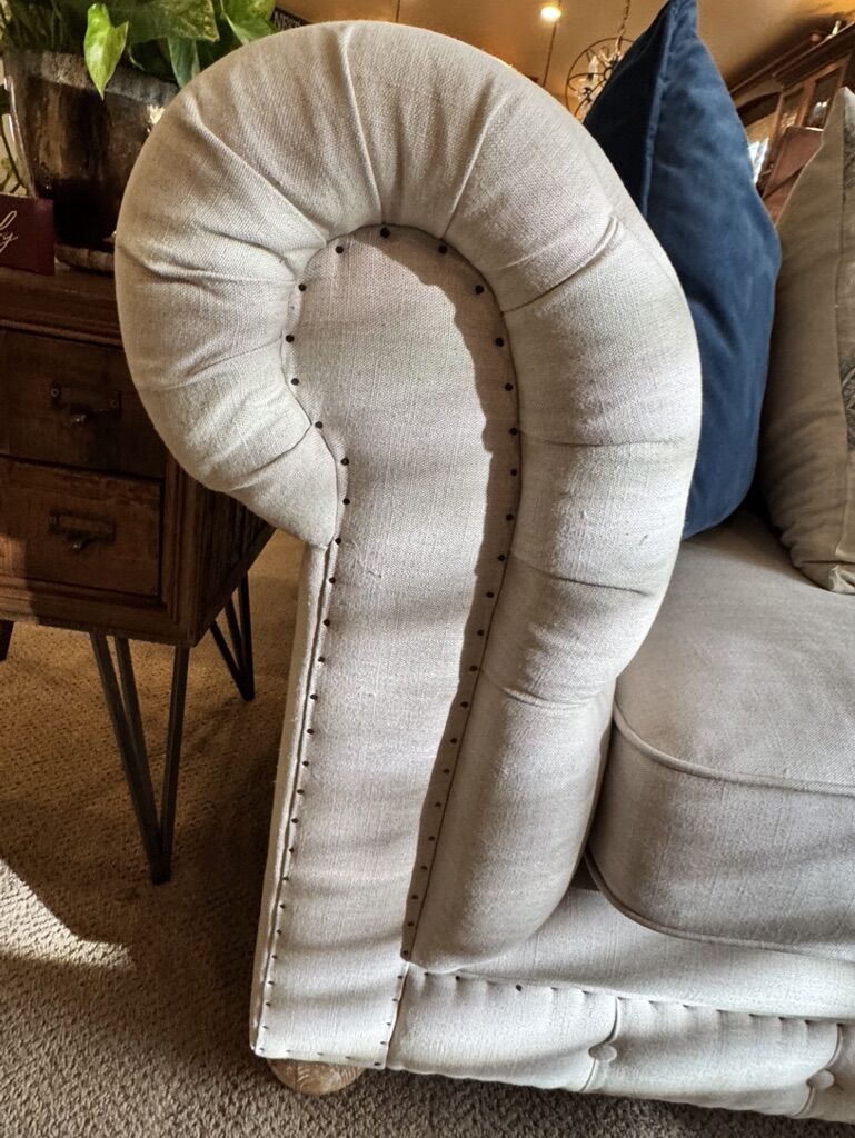 VenmoOxford Beige Linen Sectional, Right chaise lounge. Button tufted back. In decent shape, fabric is used but still has lots of life left.