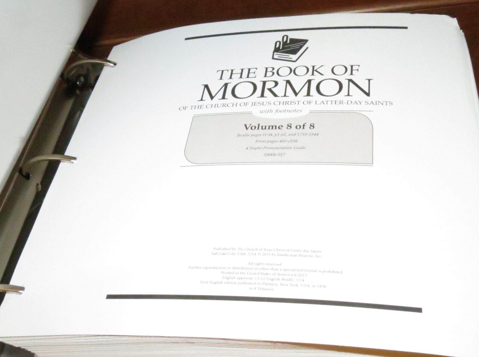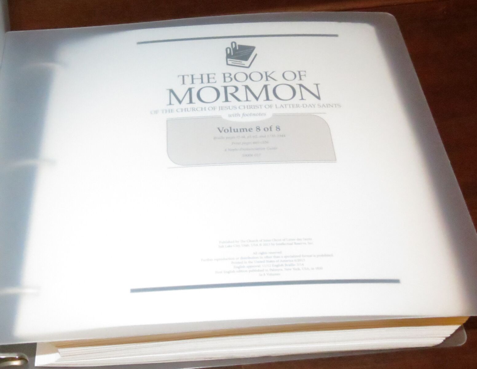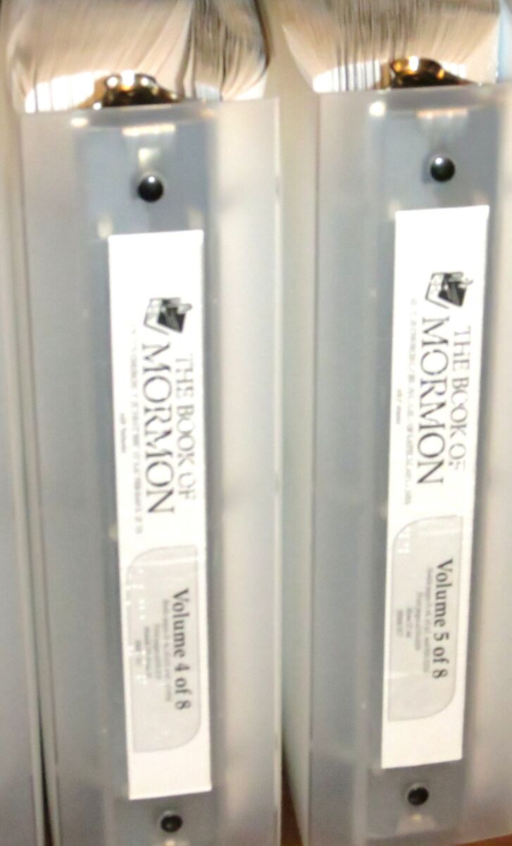 VenmoComplete in 8 volumes, in Braille (English), published by the Church of Jesus Christ of Latter-day Saints, 2013 printing. Large volumes, each in a frosted transparent binder. Excellent, clean condition.