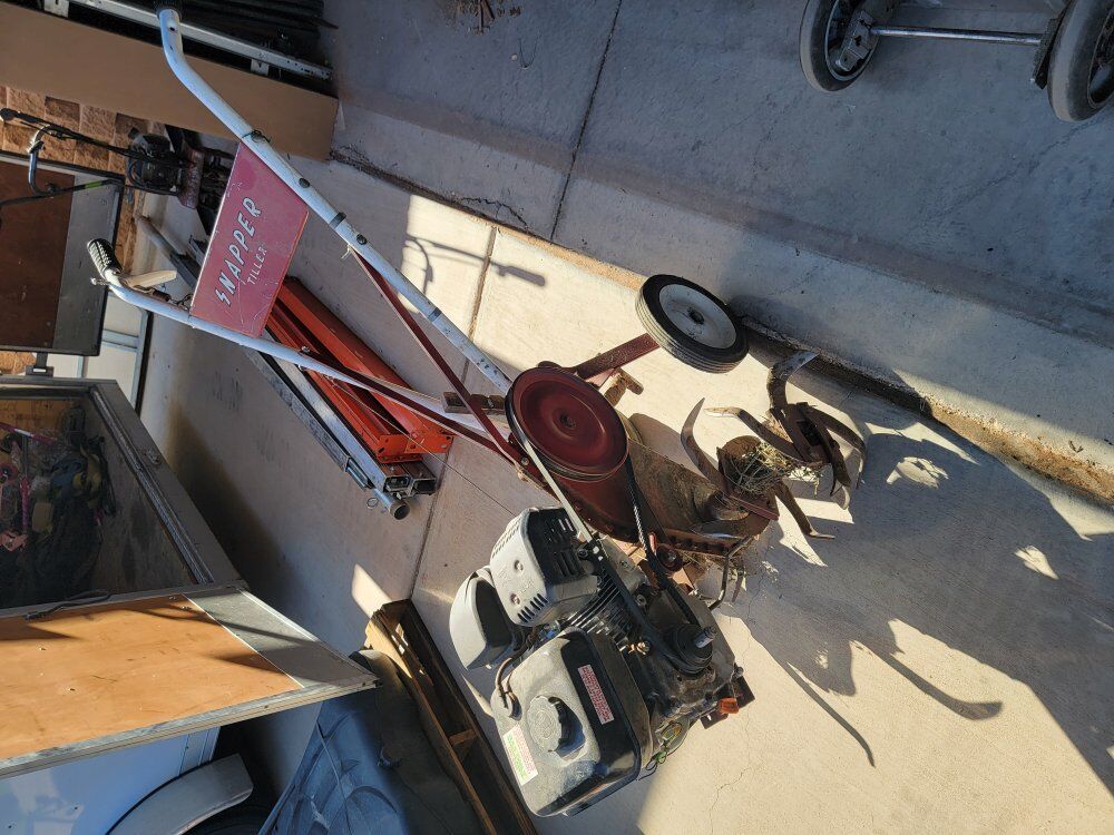 snapper tiller with harbor freight engine. works good tills deep. I moved and don't have a garden any longer.