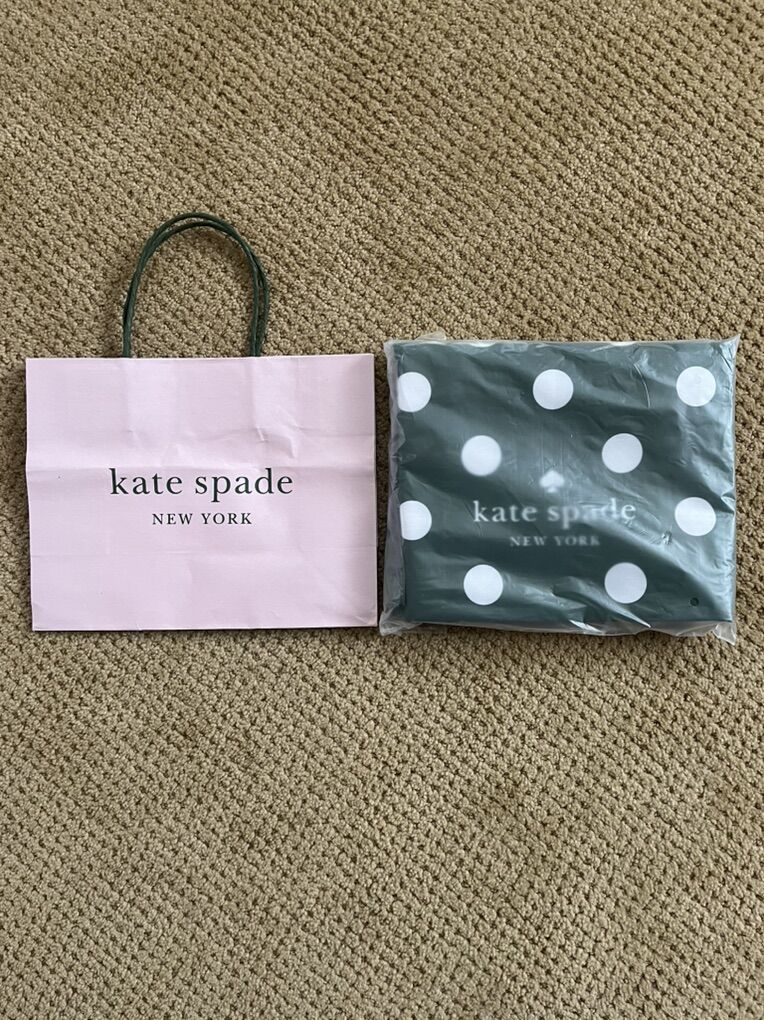 VenmoGreat Valentines idea. Brand new still in the bag. I only took it out only to take the pictures. If you love the emerald green color or polka dots. This is for you!. This says 'Kate Spade New York' on both sides. The bag is tapered. It gets a little bigger towards the bottom of the bag. The bag only, measures 15 inches tall x 24 inches across the top of the bag and 27 inches across the bottom of the bag. This even comes with the gift bag. Must See! Price is firm.