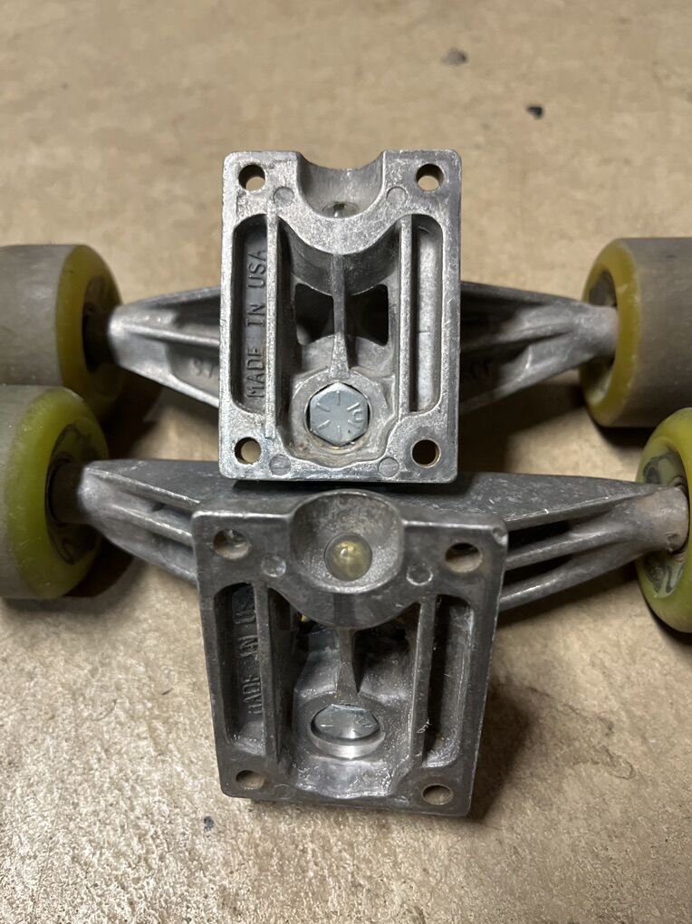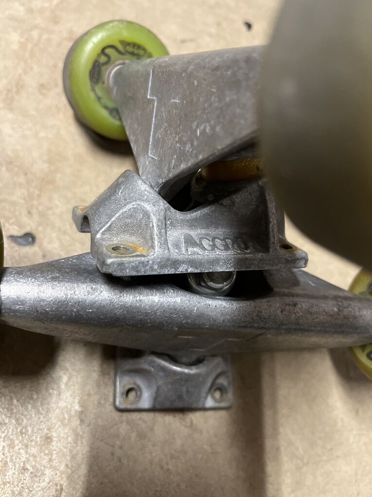 OG Tracker Aggro 8.75” Trucks with sims snake bite 57x35 95A wheels.