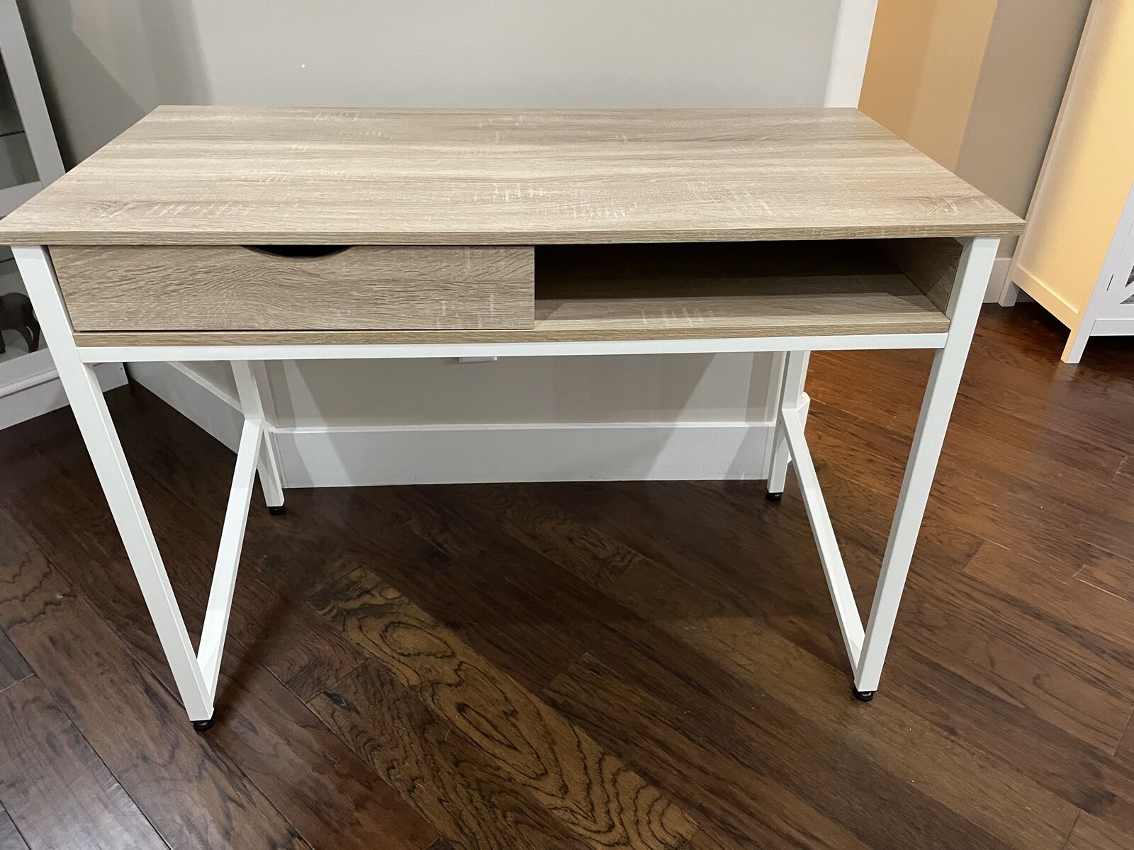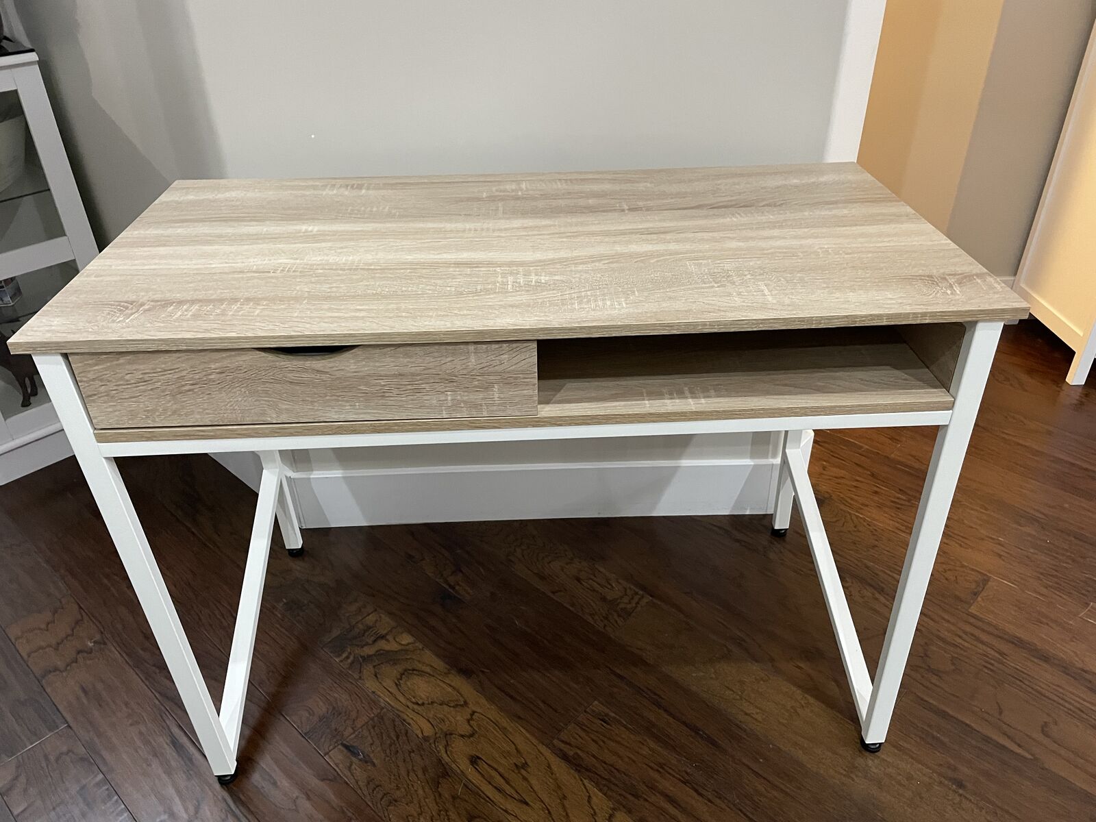 White frame with laminate top Contemporary leg design Drawer and built-in storage compartment Specifications: Maximum Depth (inches): 21.625 Maximum Height (inches): 30.75 Maximum Width (inches): 43.25 WOOD WRITING DESK: This studio writing workstation desk has has a beautiful natural wood laminate top DESK WITH DRAWER: This computer desk has a large working surface with a single drawer and extra cubby for storage HEAVY DUTY: This small desk is made from durable steel construction and is powder coated for a sleek finish USE WITH LAPTOPS: This writing station is the perfect size to work with laptops and personal tablets One drawer. Unlimited possibilities. Introducing the Safco Single Drawer Desk. With its contemporary styling, ample storage compartment and emphasis on streamlined functionality, this desk will be right at home in virtually any office, dorm or home