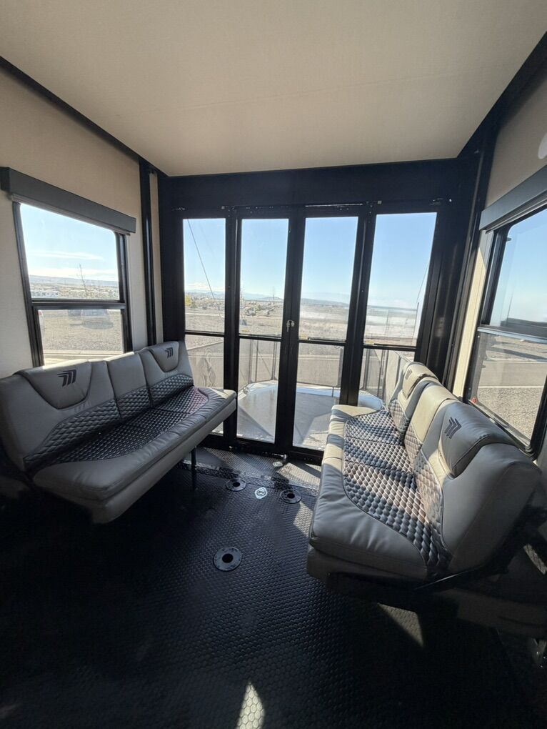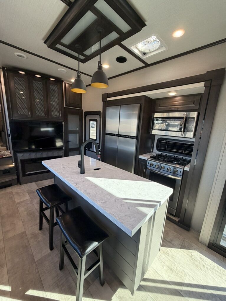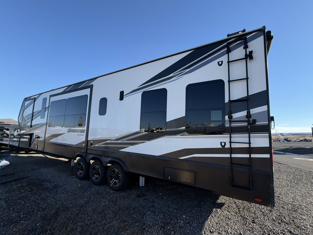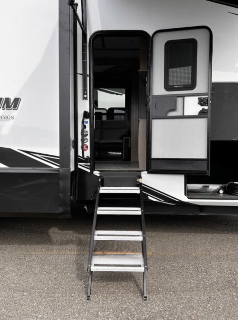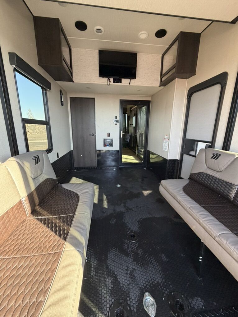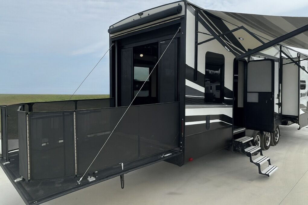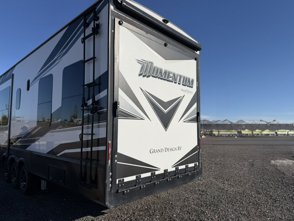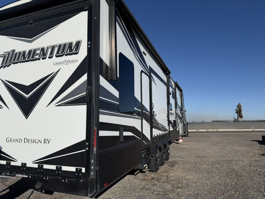 Ready for your next adventure in, this Momentum toy hauler will make it even better! It has been meticulously cared for, tons of upgrades. This is a 399th-R which means our unit has FULL size appliances. Non smoking, and always stored under covered parking. 8' 4 wide, 13' 5 high, 44 ft long. 3 Slides, 13.5 foot garage 2 patios ( both are 10x10). 3 entry doors, Full Bath and 1/2 Bath in garage. Solitude solar system and Rockford Fosgate speaker package. central Vacuum System w/ Tools and Dust Pan. Waste capacity 104 gals, Gray water 104 gals, Fresh Water 140 gals. 6-Point Hydraulic Leveling System , Upgrades Hitch to a GEN-Y, Power Patio Awning w/ LED Lights, Cummins Onan 5500 generator, fully maintained, 3 AC’s15K BTUs, and a fuel caddy with fuel capacity of 60 gallons. Having the kitchen fold-down side patio is a game changer, with an exterior LED TV, and an addition garage patio for even more room. To extend the living area I have a brand new MoRyde PatioEx Tent enclosure ($1500) for the garage patio. 3 more LED TVs inside. The front master suite has an upgraded King bed. Grand Design Momentum 399R has a 8 feet, 5 inches (8' 5) ceiling height for the Master bedroom. The living room has an electric fireplace and theater seating with heat/massage and removable swivel tables also the LED Lighting Package. The kitchen has an island with bar stools, gas range, and full size fridge. The Momentum has the Weather-Tek insulation, and the Tuff Ply gas-and-oil-resistant garage flooring, the flush-mount tie-downs rated for 2,500 LBS, and a protective diamond plate on the garage sidewalls for additional protection. GREAT CLEAN UNIT. TITLE IN HAND.