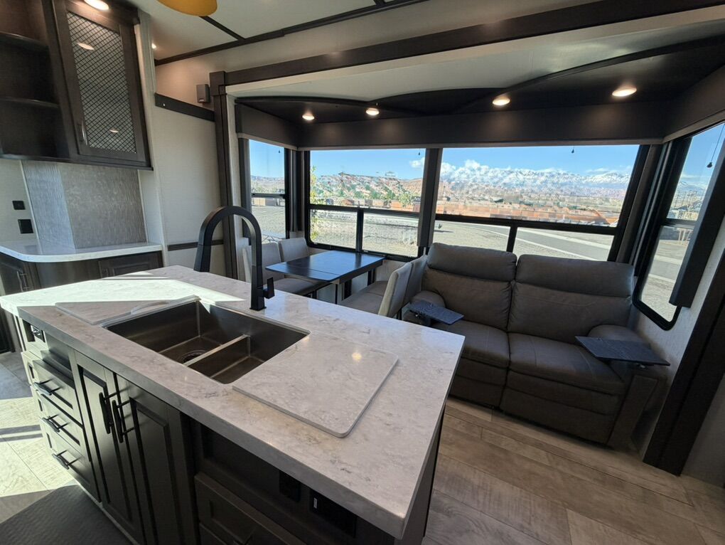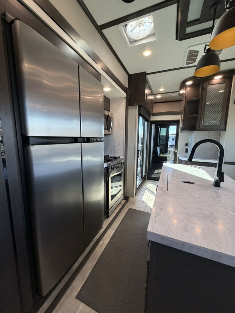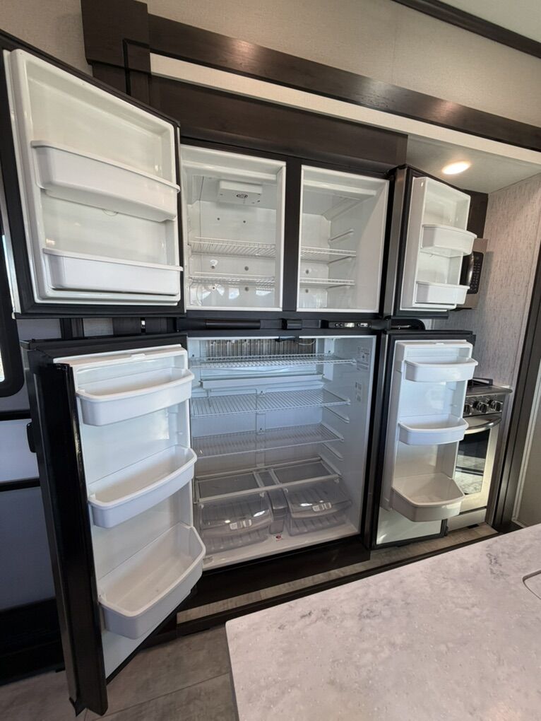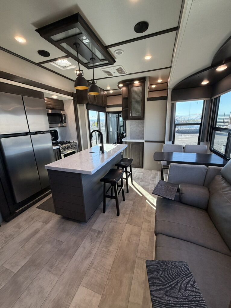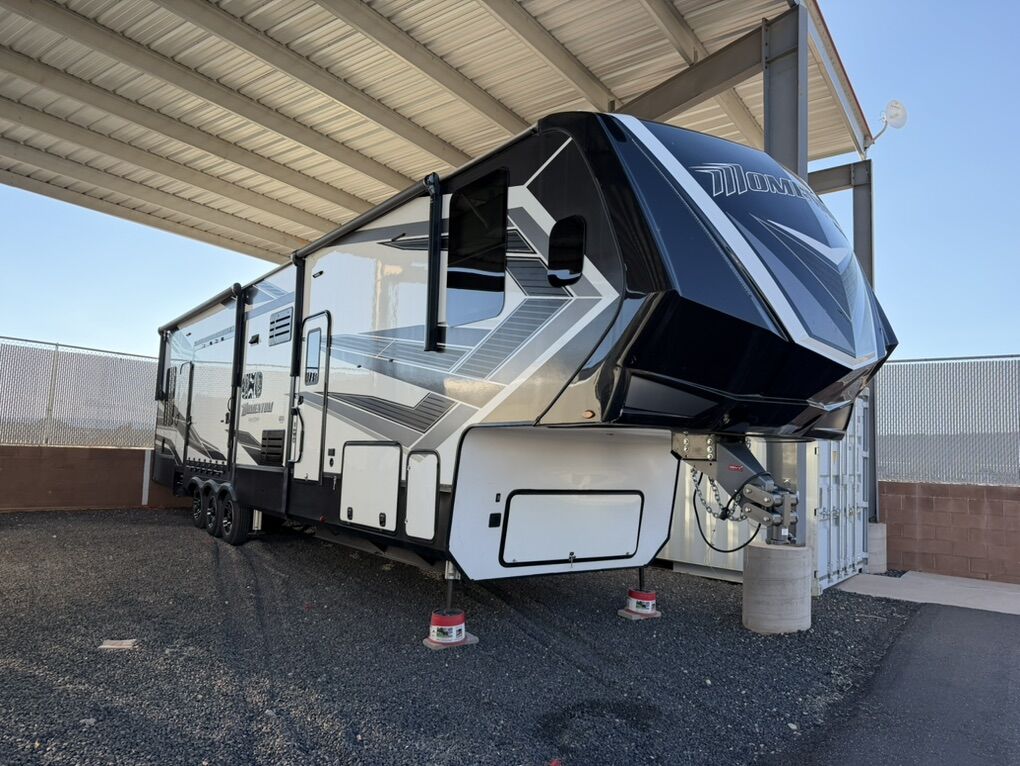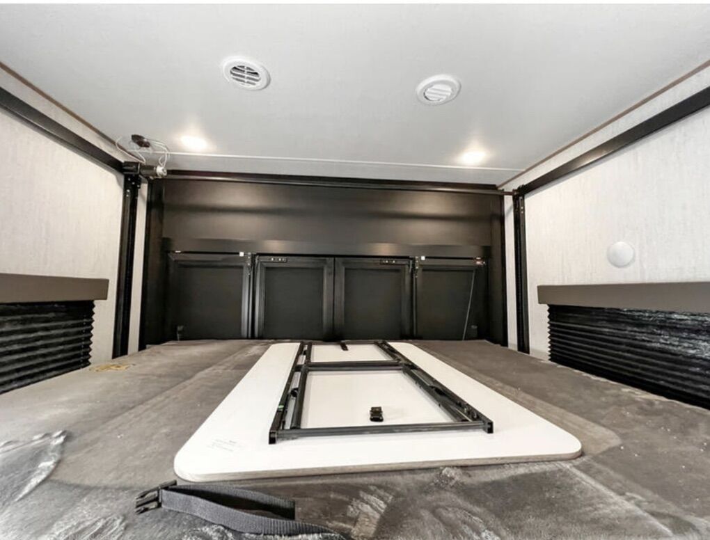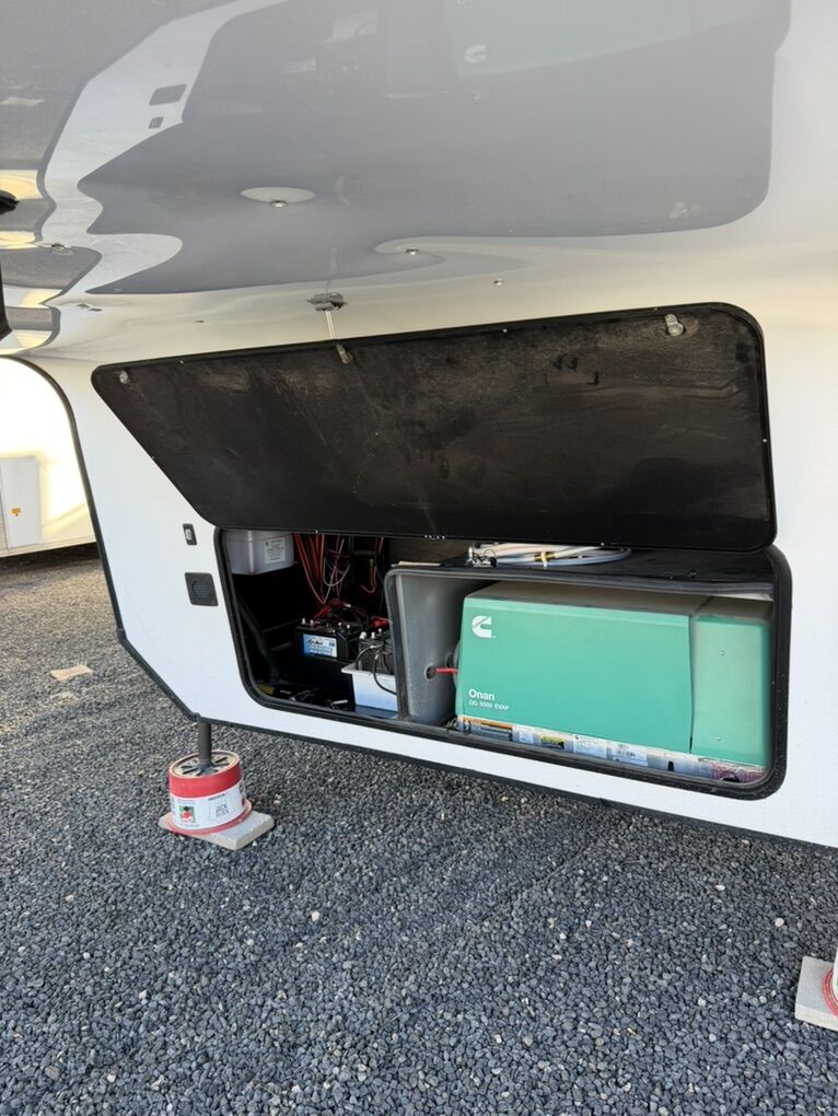 Ready for your next adventure in, this Momentum toy hauler will make it even better! It has been meticulously cared for, tons of upgrades. This is a 399th-R which means our unit has FULL size appliances. Non smoking, and always stored under covered parking. 8' 4 wide, 13' 5 high, 44 ft long. 3 Slides, 13.5 foot garage 2 patios ( both are 10x10). 3 entry doors, Full Bath and 1/2 Bath in garage. Solitude solar system and Rockford Fosgate speaker package. central Vacuum System w/ Tools and Dust Pan. Waste capacity 104 gals, Gray water 104 gals, Fresh Water 140 gals. 6-Point Hydraulic Leveling System , Upgrades Hitch to a GEN-Y, Power Patio Awning w/ LED Lights, Cummins Onan 5500 generator, fully maintained, 3 AC’s15K BTUs, and a fuel caddy with fuel capacity of 60 gallons. Having the kitchen fold-down side patio is a game changer, with an exterior LED TV, and an addition garage patio for even more room. To extend the living area I have a brand new MoRyde PatioEx Tent enclosure ($1500) for the garage patio. 3 more LED TVs inside. The front master suite has an upgraded King bed. Grand Design Momentum 399R has a 8 feet, 5 inches (8' 5) ceiling height for the Master bedroom. The living room has an electric fireplace and theater seating with heat/massage and removable swivel tables also the LED Lighting Package. The kitchen has an island with bar stools, gas range, and full size fridge. The Momentum has the Weather-Tek insulation, and the Tuff Ply gas-and-oil-resistant garage flooring, the flush-mount tie-downs rated for 2,500 LBS, and a protective diamond plate on the garage sidewalls for additional protection. GREAT CLEAN UNIT. TITLE IN HAND.