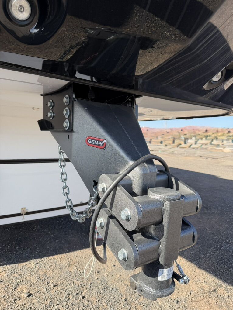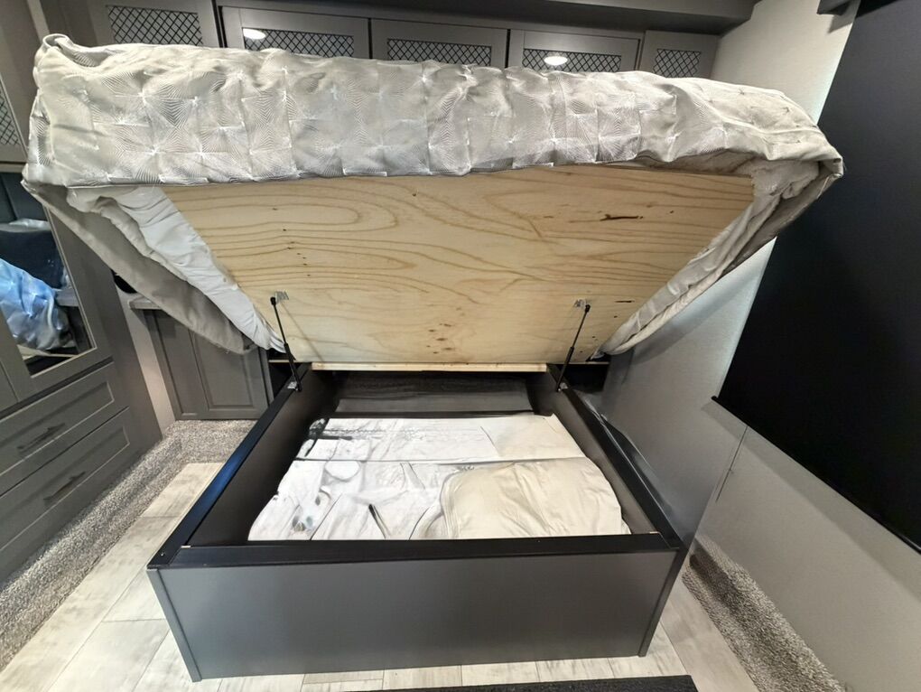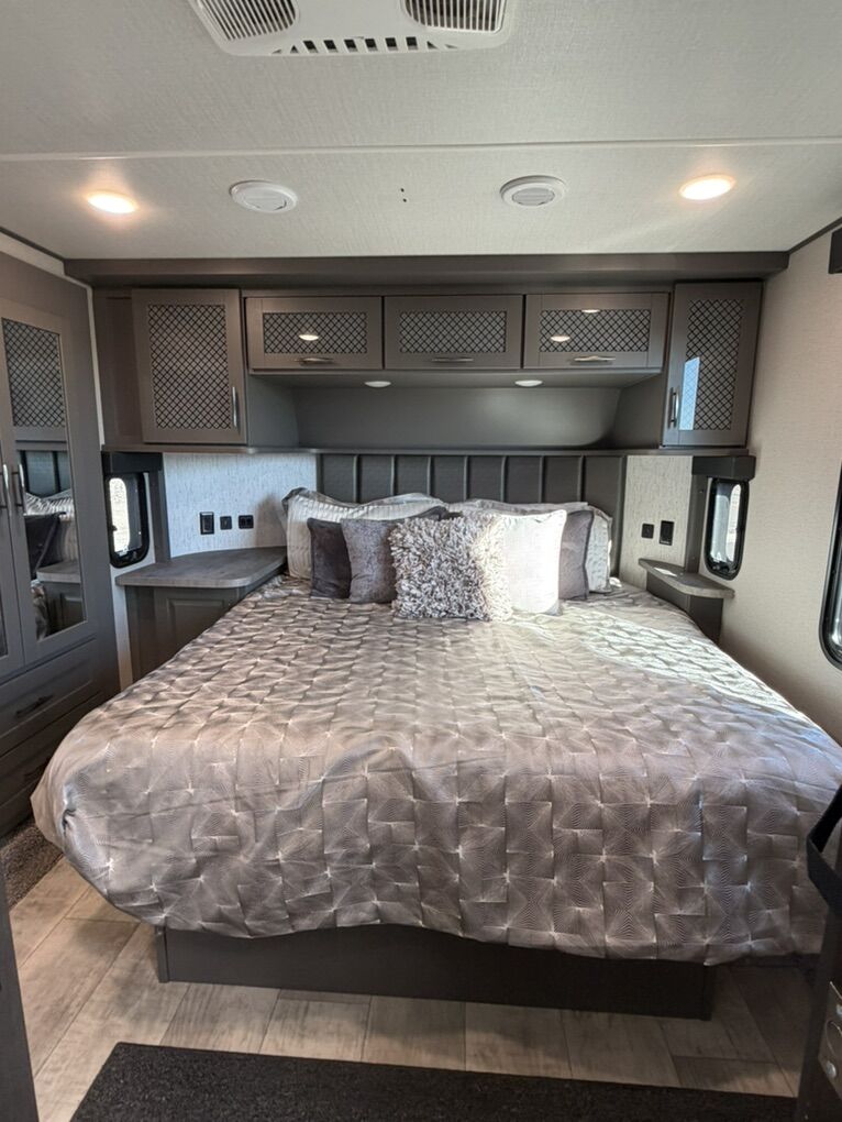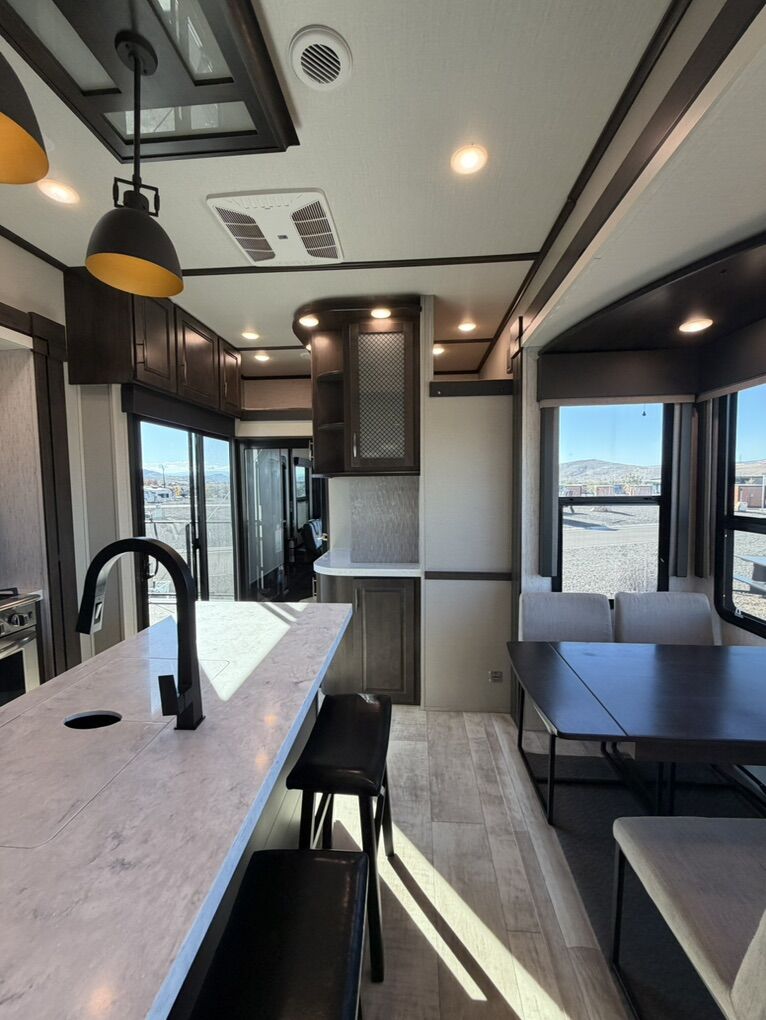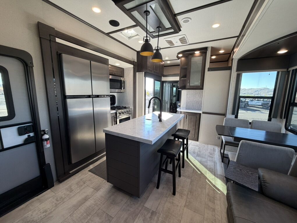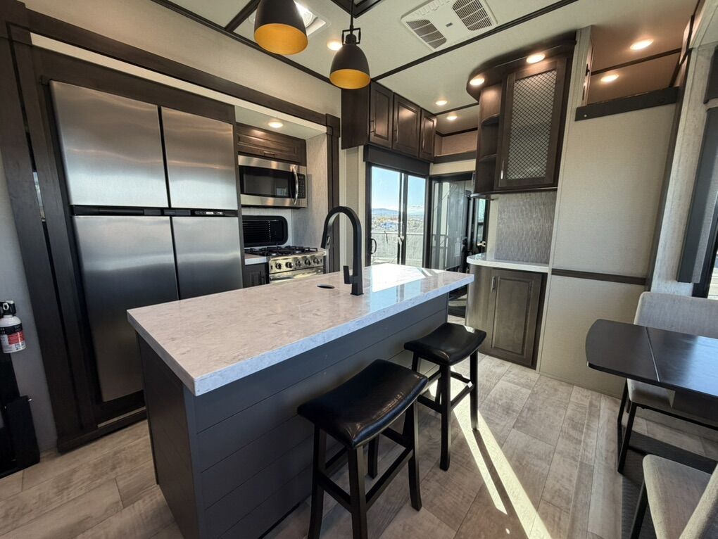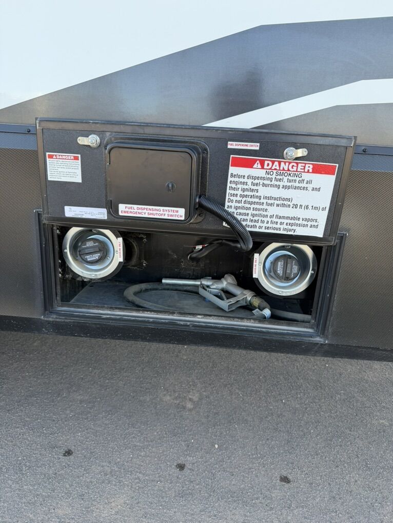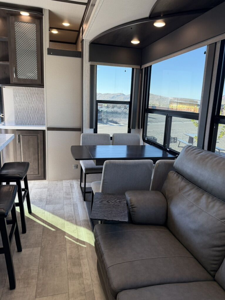 Ready for your next adventure in, this Momentum toy hauler will make it even better! It has been meticulously cared for, tons of upgrades. This is a 399th-R which means our unit has FULL size appliances. Non smoking, and always stored under covered parking. 8' 4 wide, 13' 5 high, 44 ft long. 3 Slides, 13.5 foot garage 2 patios ( both are 10x10). 3 entry doors, Full Bath and 1/2 Bath in garage. Solitude solar system and Rockford Fosgate speaker package. central Vacuum System w/ Tools and Dust Pan. Waste capacity 104 gals, Gray water 104 gals, Fresh Water 140 gals. 6-Point Hydraulic Leveling System , Upgrades Hitch to a GEN-Y, Power Patio Awning w/ LED Lights, Cummins Onan 5500 generator, fully maintained, 3 AC’s15K BTUs, and a fuel caddy with fuel capacity of 60 gallons. Having the kitchen fold-down side patio is a game changer, with an exterior LED TV, and an addition garage patio for even more room. To extend the living area I have a brand new MoRyde PatioEx Tent enclosure ($1500) for the garage patio. 3 more LED TVs inside. The front master suite has an upgraded King bed. Grand Design Momentum 399R has a 8 feet, 5 inches (8' 5) ceiling height for the Master bedroom. The living room has an electric fireplace and theater seating with heat/massage and removable swivel tables also the LED Lighting Package. The kitchen has an island with bar stools, gas range, and full size fridge. The Momentum has the Weather-Tek insulation, and the Tuff Ply gas-and-oil-resistant garage flooring, the flush-mount tie-downs rated for 2,500 LBS, and a protective diamond plate on the garage sidewalls for additional protection. GREAT CLEAN UNIT. TITLE IN HAND.