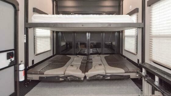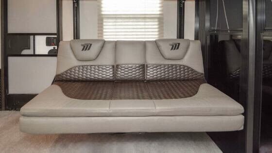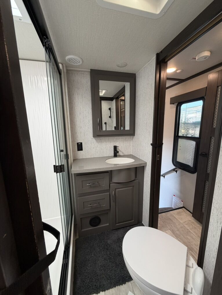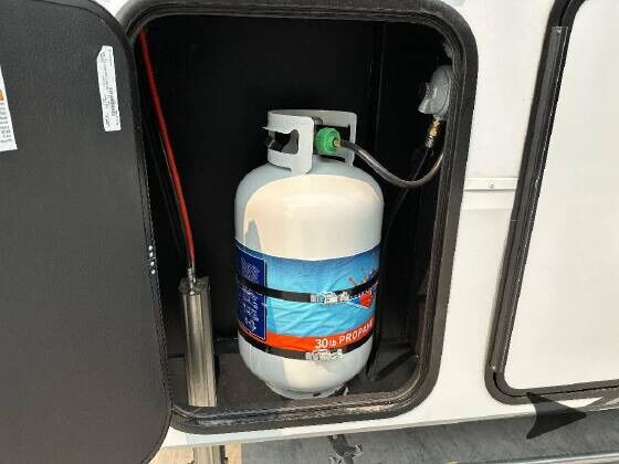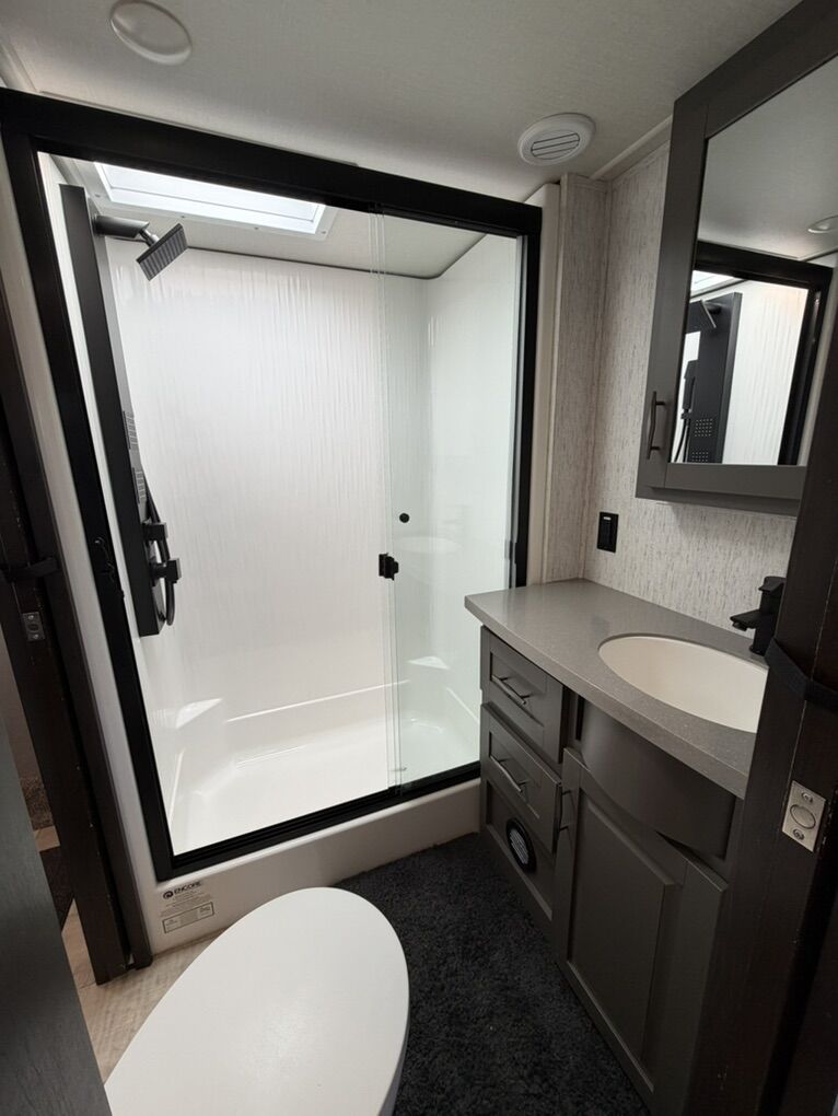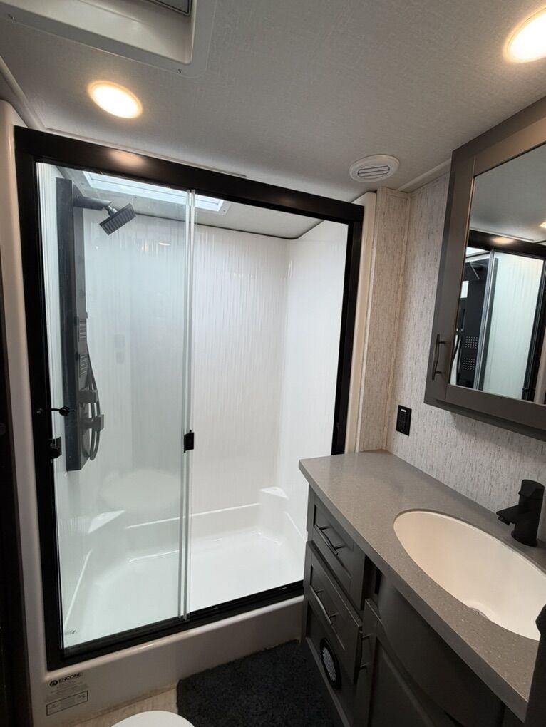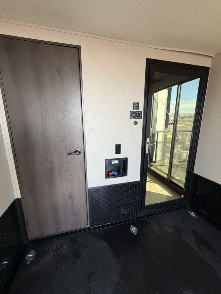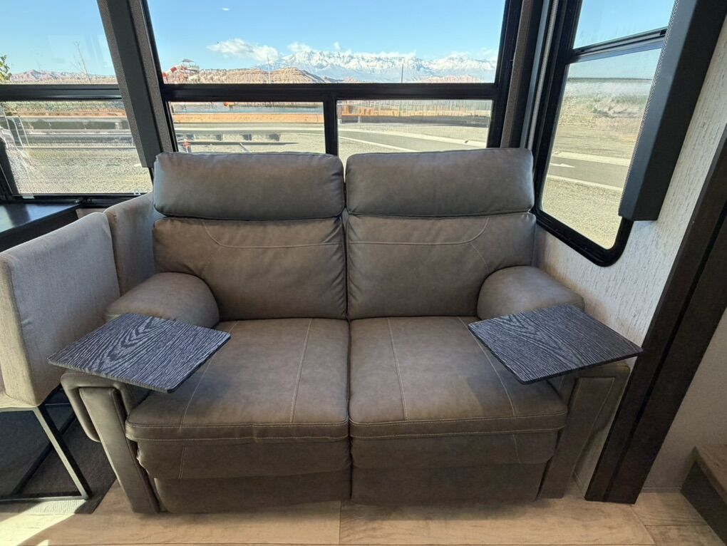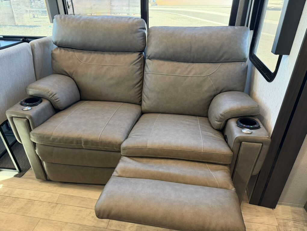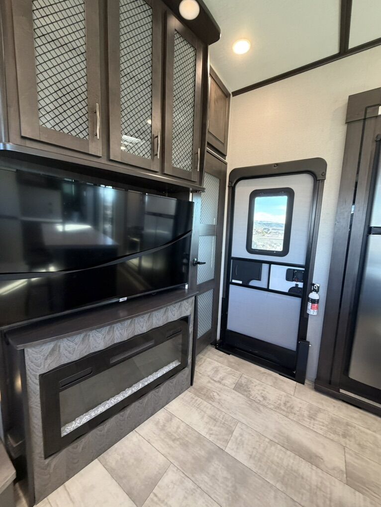 Ready for your next adventure in, this Momentum toy hauler will make it even better! It has been meticulously cared for, tons of upgrades. This is a 399th-R which means our unit has FULL size appliances. Non smoking, and always stored under covered parking. 8' 4 wide, 13' 5 high, 44 ft long. 3 Slides, 13.5 foot garage 2 patios ( both are 10x10). 3 entry doors, Full Bath and 1/2 Bath in garage. Solitude solar system and Rockford Fosgate speaker package. central Vacuum System w/ Tools and Dust Pan. Waste capacity 104 gals, Gray water 104 gals, Fresh Water 140 gals. 6-Point Hydraulic Leveling System , Upgrades Hitch to a GEN-Y, Power Patio Awning w/ LED Lights, Cummins Onan 5500 generator, fully maintained, 3 AC’s15K BTUs, and a fuel caddy with fuel capacity of 60 gallons. Having the kitchen fold-down side patio is a game changer, with an exterior LED TV, and an addition garage patio for even more room. To extend the living area I have a brand new MoRyde PatioEx Tent enclosure ($1500) for the garage patio. 3 more LED TVs inside. The front master suite has an upgraded King bed. Grand Design Momentum 399R has a 8 feet, 5 inches (8' 5) ceiling height for the Master bedroom. The living room has an electric fireplace and theater seating with heat/massage and removable swivel tables also the LED Lighting Package. The kitchen has an island with bar stools, gas range, and full size fridge. The Momentum has the Weather-Tek insulation, and the Tuff Ply gas-and-oil-resistant garage flooring, the flush-mount tie-downs rated for 2,500 LBS, and a protective diamond plate on the garage sidewalls for additional protection. GREAT CLEAN UNIT. TITLE IN HAND.
