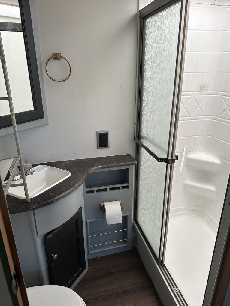 Engine: Triton V10 Gas Generator 2,033 hours Slides: 2 AC/Heating: With thermostat Kitchen: Full with oven, stove, microwave, fridge, and freezer Sleeping Capacity: Queen bed, twin bed, extra space for more Exterior: Outdoor awning, plenty of compartments for storage, self leveling jacks, towing hitch, easy engine access.