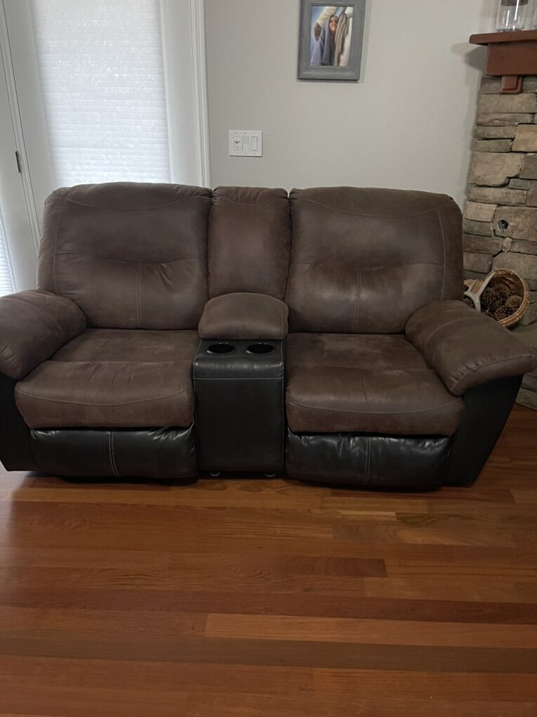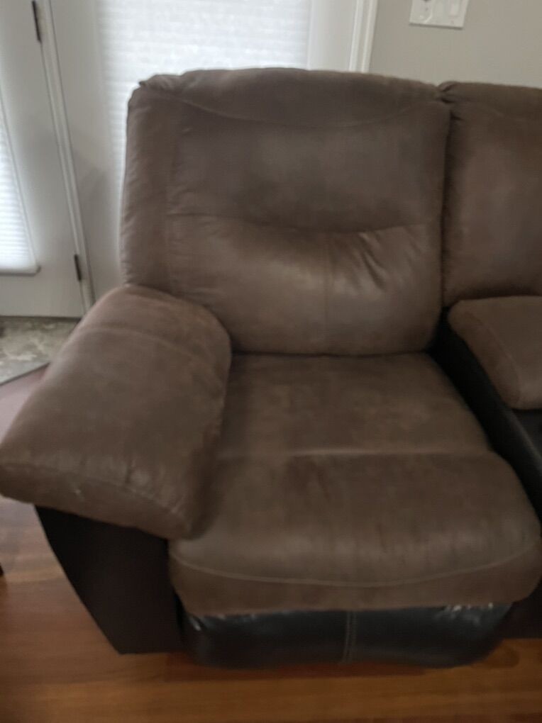 VenmoGreat shape and very comfortable. Brown with a suede type fabric and Naugahyde. Two seated with button on the sides to lift legs and recline back. Center console to keep controls in or other things to store. Two cup holders and an armrest. No scratches, tears or damage. It’s in great condition. The photography doesn’t do it justice.