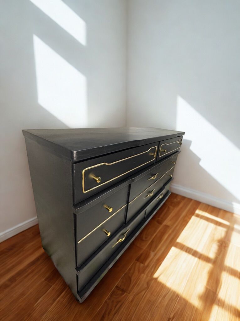 VenmoLong MCM dresser with brass inlay original pulls. Vintage still sourced knobs in brass. 50” wide 18” deep 32” tall.