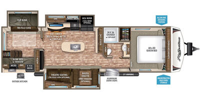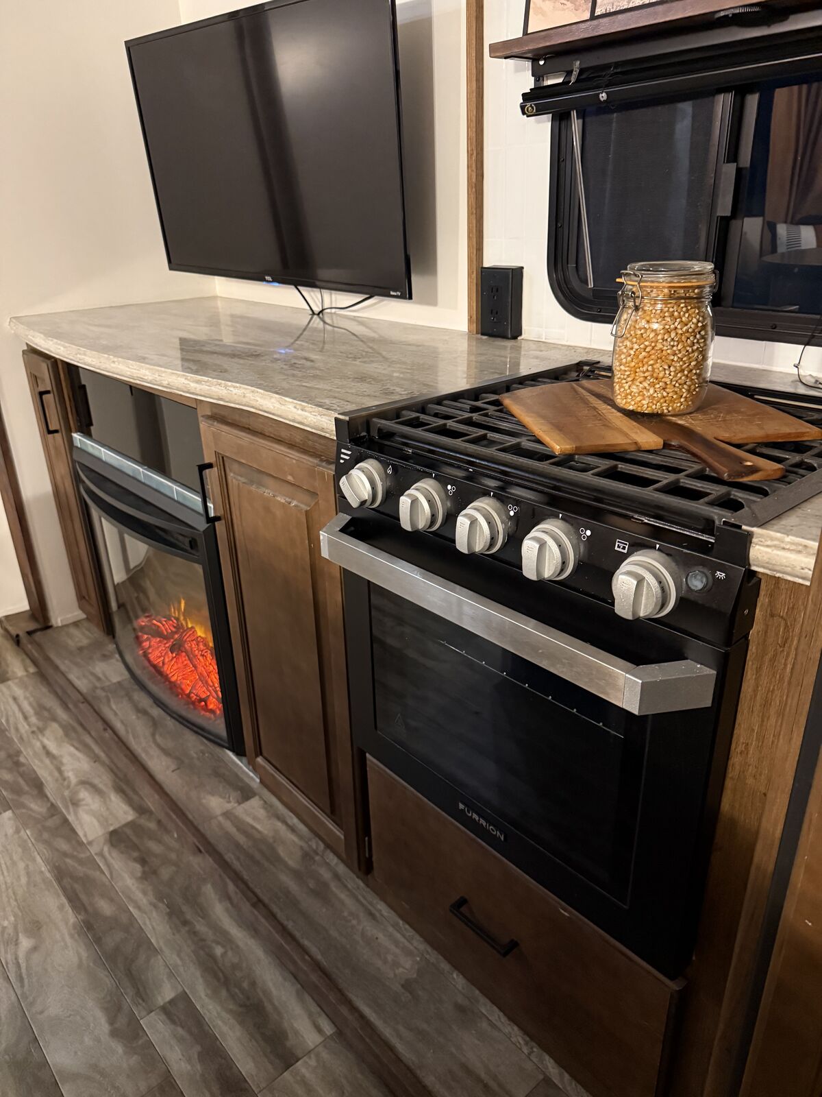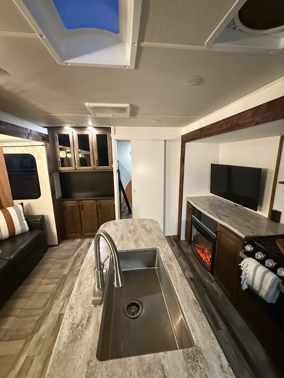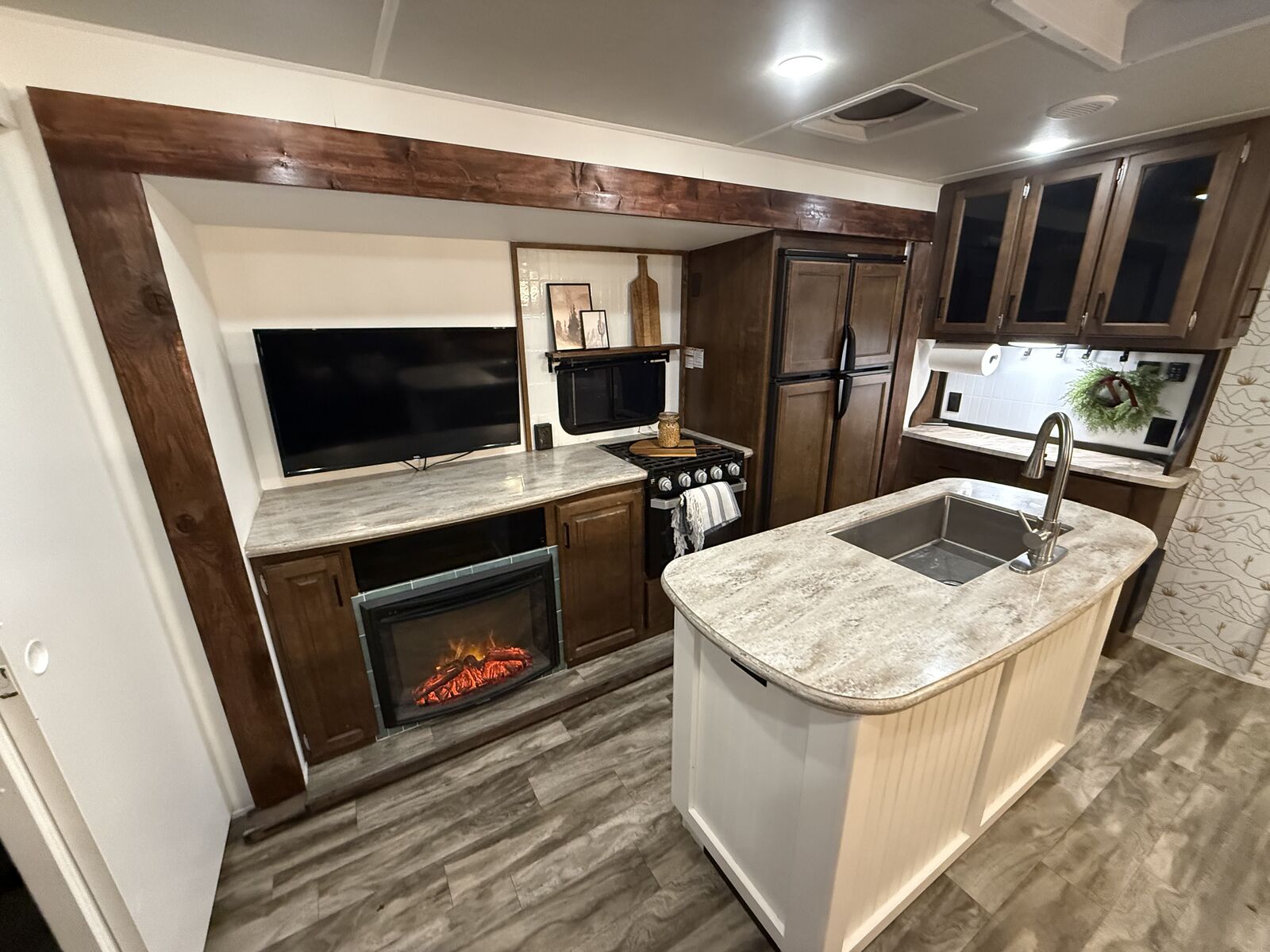 Great tank capacities. Fireplace. Huge fridge and freezer. Propane oven. Microwave. Double sink. Kitchen island. Tons of counter space. Smart TV.