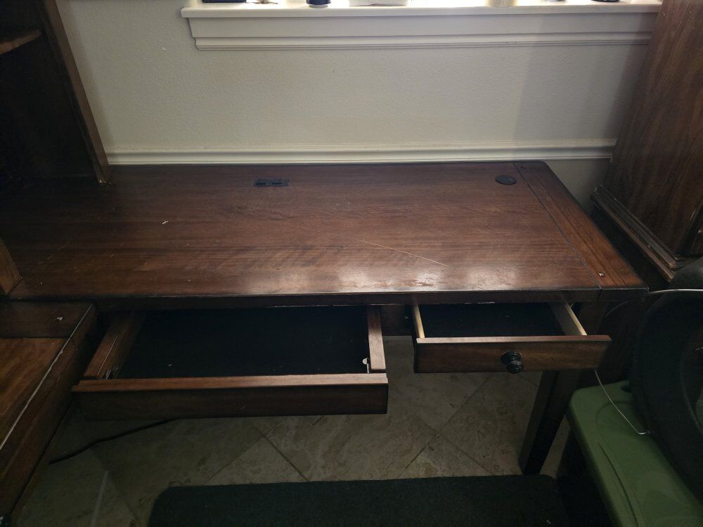 ZelleLarge, solid wood executive-style desk by Aspen Home. Great for a home office and offers tons of workspace and storage. • L-shaped layout (about 58" x 65") • Desk height: 31" | With hutch: ~75.5" • Includes removable hutch with shelves and cabinets • Locking file drawers • Two long drawers for keyboard use • Drawers slide smoothly • Excellent condition with minor wear Hutch can be removed for transport. This is a heavy, solid wood piece—you’ll need a truck and at least two people to load. Asking $700. Pickup only.
