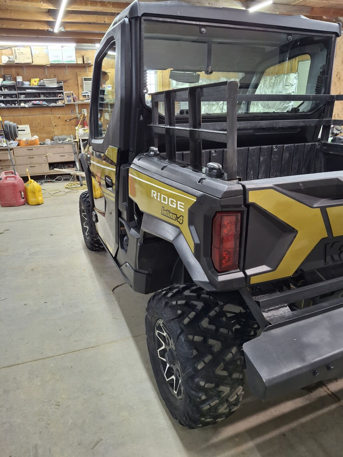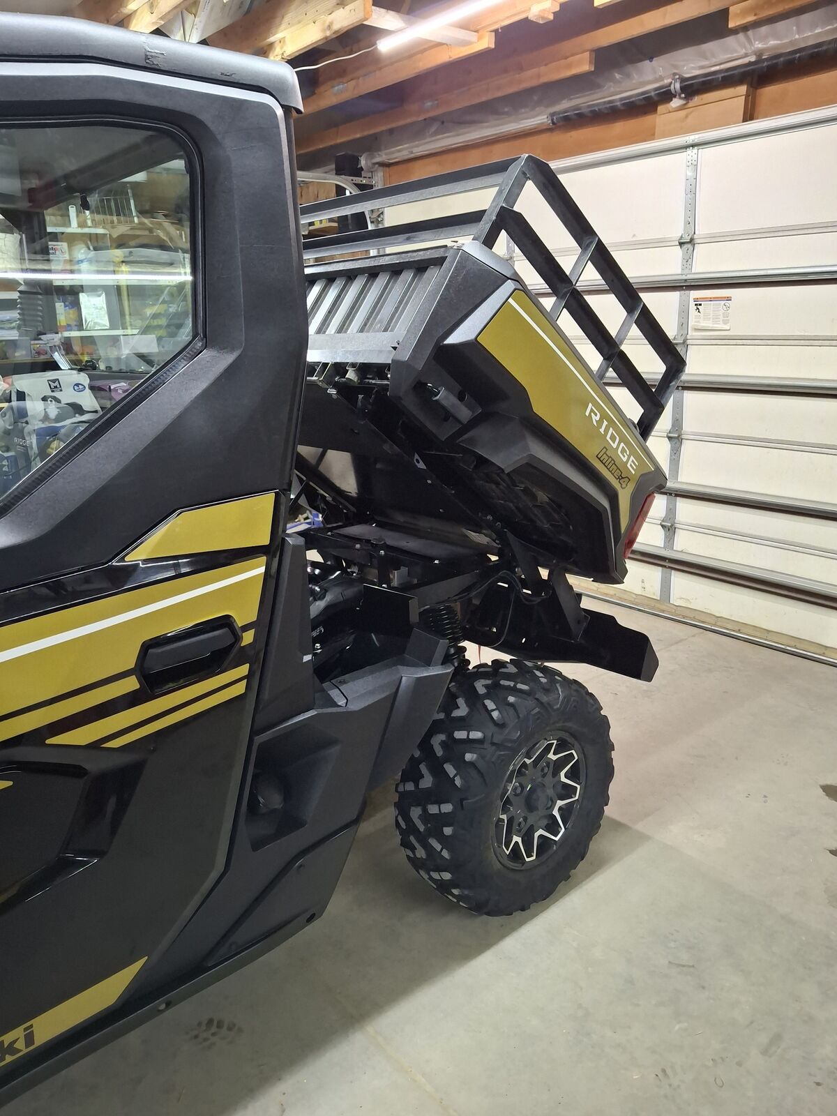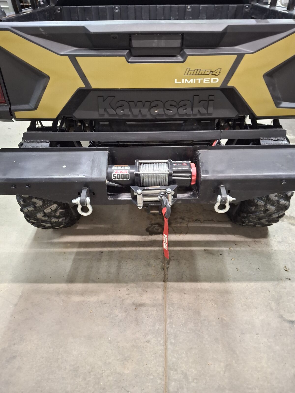 I have custom built a rear bumper. Kawasaki's stock rear bumper is complete garbage. It actually had a warning lable telling you not to use it as a step, as it could break. The custom rear bumper is extremely heavy duty, with a 5,000 pound winch installed. Controls for the winch are mounted outside of the machine with a remote control port as well. I also built a custom rear rack. Made from 1 1/2' angle iron and mounted with Kawasaki box mounts. It can be removed in one minutes.