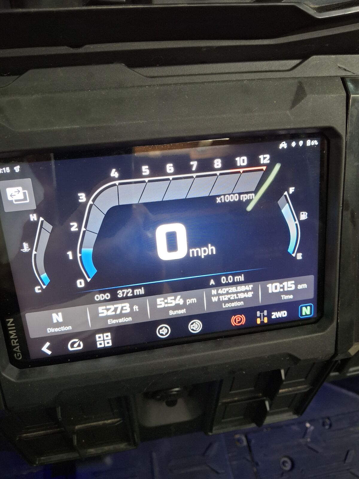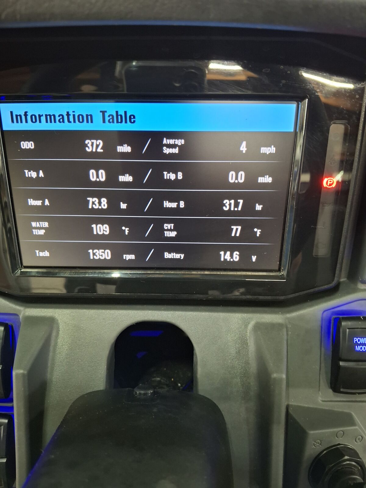 This is virutally a new machine. It has 372 miles on it, and oil has been changed several times. As you can see from the pictures, it is in fantastic condition. It comes stock with the following. Full hard cab with tempered glass windows in perfect shape, wind shield wiper and washer, Garmin GPS (infotainment center), Stereo system, heater and air conditioning, front synthetic rope winch, 4 wheel drive with rear differential lock. Machine is quite fast and powerful, very smooth, with power steering.