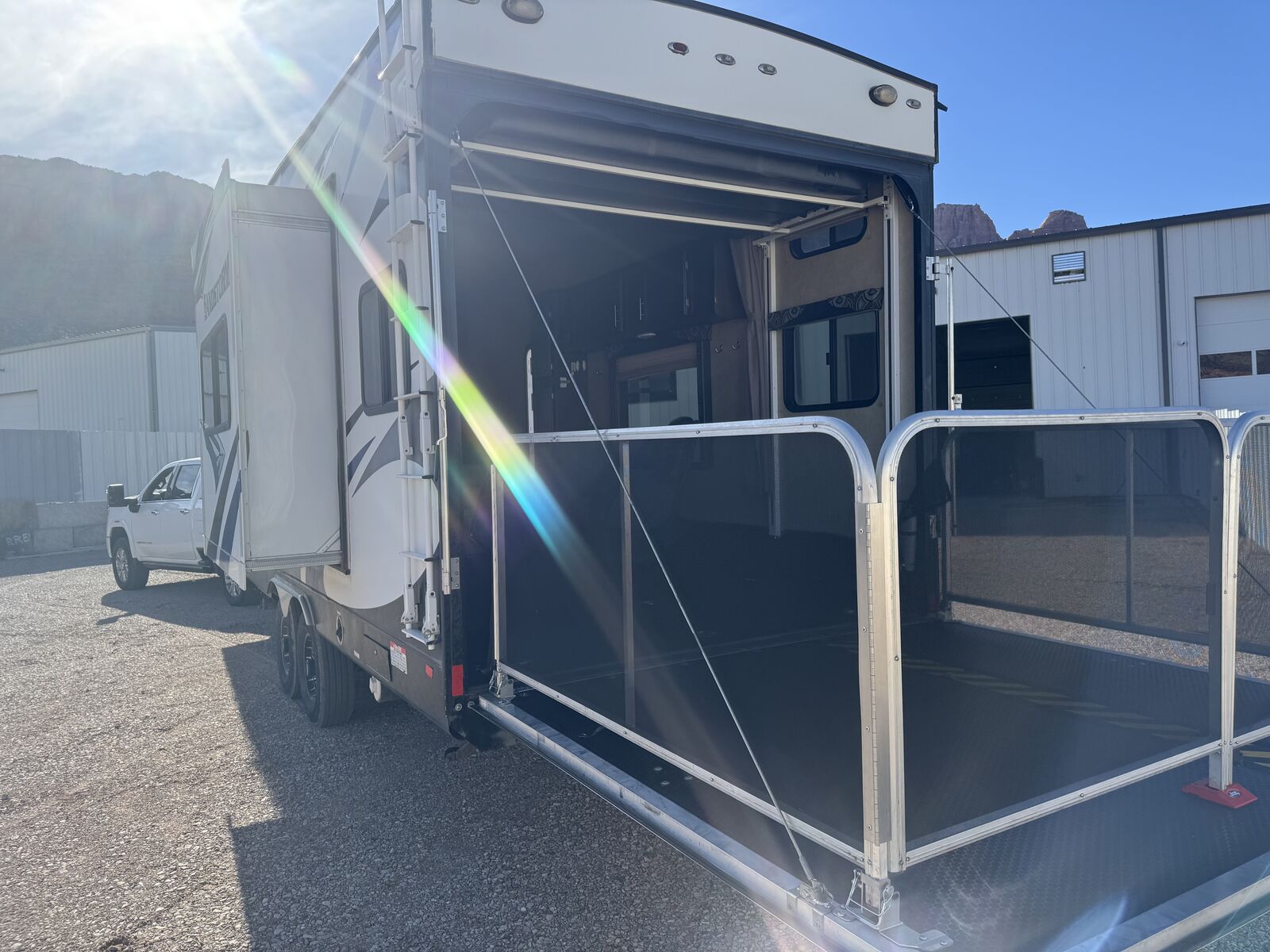 Equipped with 4000W Gen and 400 W Solar, 222 hrs on gen, 4 new tires, 2 slideouts, Queen bed, 12' garage, 2 - 42" Beds in Garage,40 gal gas tank for Gen and Toys, Ramp makes into a patio deck W/Rails on Deck, Large Pass through compartment
