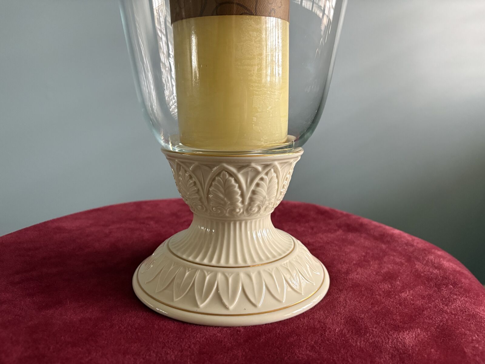Hurricane Lamp with Lenox Illumination Base; flared 10" diameter hurricane lamp sitting on top of a Lenox illumination base; 14' tall; accent wreath as shown in photo is also available; wreath is faux magnolia and fruit; wreath is 24" diameter; wreath is an additional $15