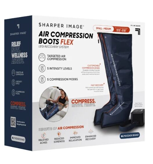 The Sharper Image® Air Compression Boots Flex deliver targeted compression to ease sore legs, improve relaxation, relieve aches, and speed up recovery. With five programs, five intensity levels, and the option to use one or both boots, you can customize every session to fit your needs. The control unit makes adjusting settings easy, while the foldable, travel-ready design ensures recovery is always within reach. Ideal after workouts or long days, these boots are your new go-to for comfort and performance.