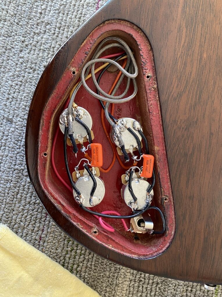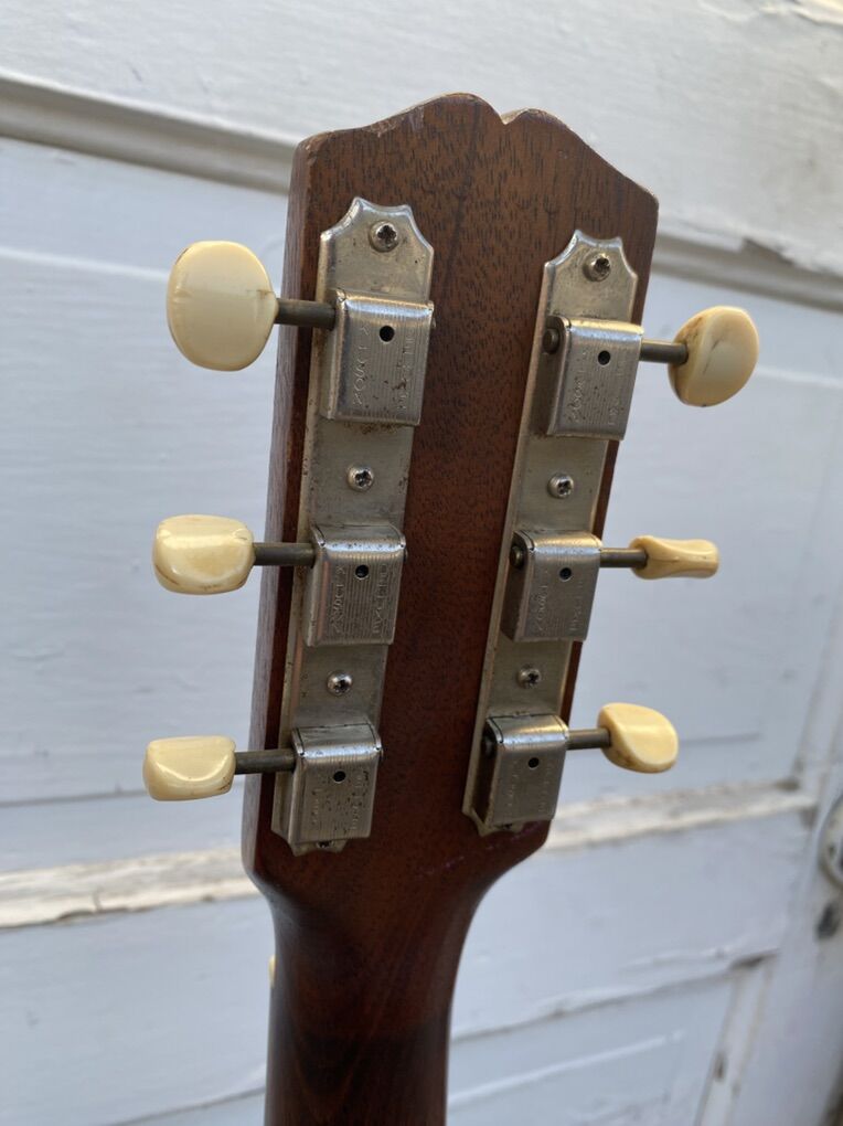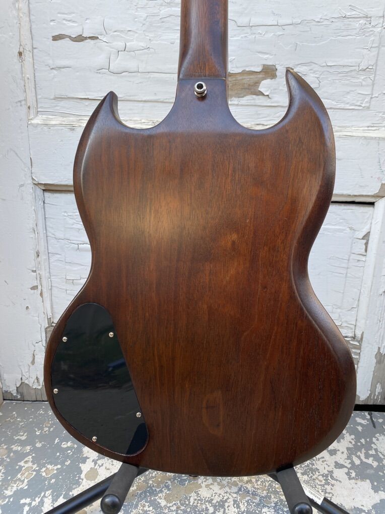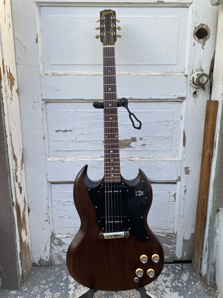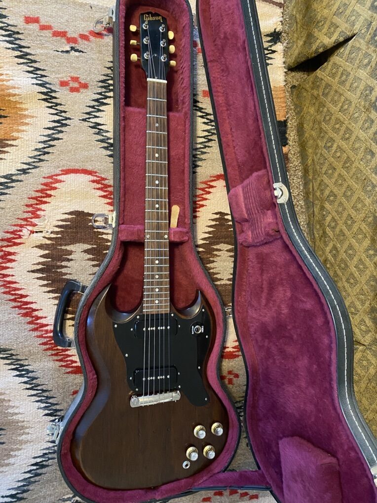 This guitar plays excellently. The truss rod functions flawlessly. The finish on the neck is a dream. This was originally Cardinal Red. Someone long before me refinished it poorly in a nasty brown. I sanded that back and re refinished it myself. It’s a very resonant and articulate guitar even unplugged. The Wolfetones are the perfect P90 and really being out and sweeten all the best bits of this guitar and make any amp sing. It is a rock and roll machine for sure, but if you play with nuance and dynamics you’ll appreciate it even more. It’s never had a headstock break. It has had a neck reset for proper Gibson angle. And it once had a hole drilled for a pickup selected that has been patched. You’ll see that right below the pickguard. I’ll include the vintage case. I believe it came from an early 70’s SG. This is not the original flimsy case that came with Melody Makers. Thanks for checking this out. Text is best. Cheers