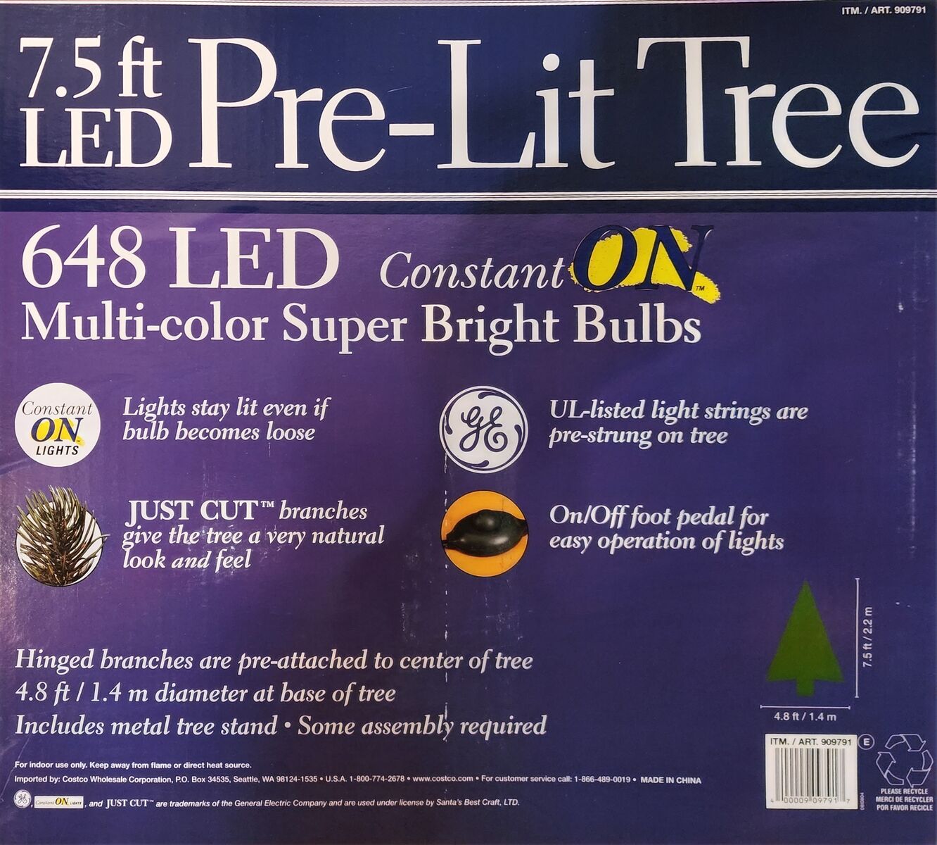 Venmo648 LED multi-color super bright bulbs with ConstantON technology. (If one light goes out, others stay on.) On/off foot pedal. Extra bulbs. Tree separates into 3 sections for storage. We have the original box, but we have been able to store it set up, covered. Includes metal tree stand. It's a lovely tree but we are needing to downsize.