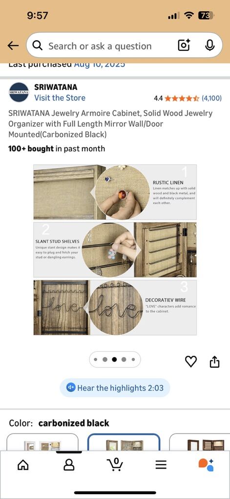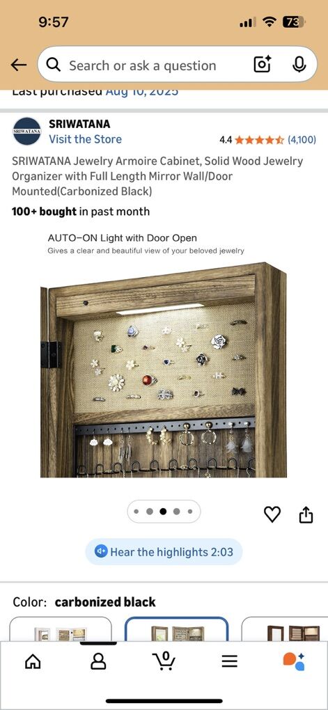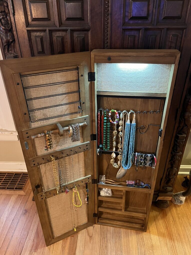 Venmo️️Nice solid, rustic wood hanging (or not) jewelry organizer cabinet with mirror on the front. Lot’s of different ways to hand necklaces, bracelets, earrings, store rings, and shelves for other things like makeup etc. I purchased this from Amazon, but overestimated my will to organize my jewelry this extensively. It’s “used” as far as the jewelry I have in there (not included). All parts for hanging it included, as well as keys for locking it when closed and batteries for the light that comes on when opened. Please see all pictures included for dimensions and specs - they should answer all of your questions Original sale price was $99.97. Search on Amazon - SRIWATANA Jewelry Armoire Cabinet, Solid Wood Jewelry Organizer with Full Length Mirror Wall/Door Mounted(Carbonized Black)