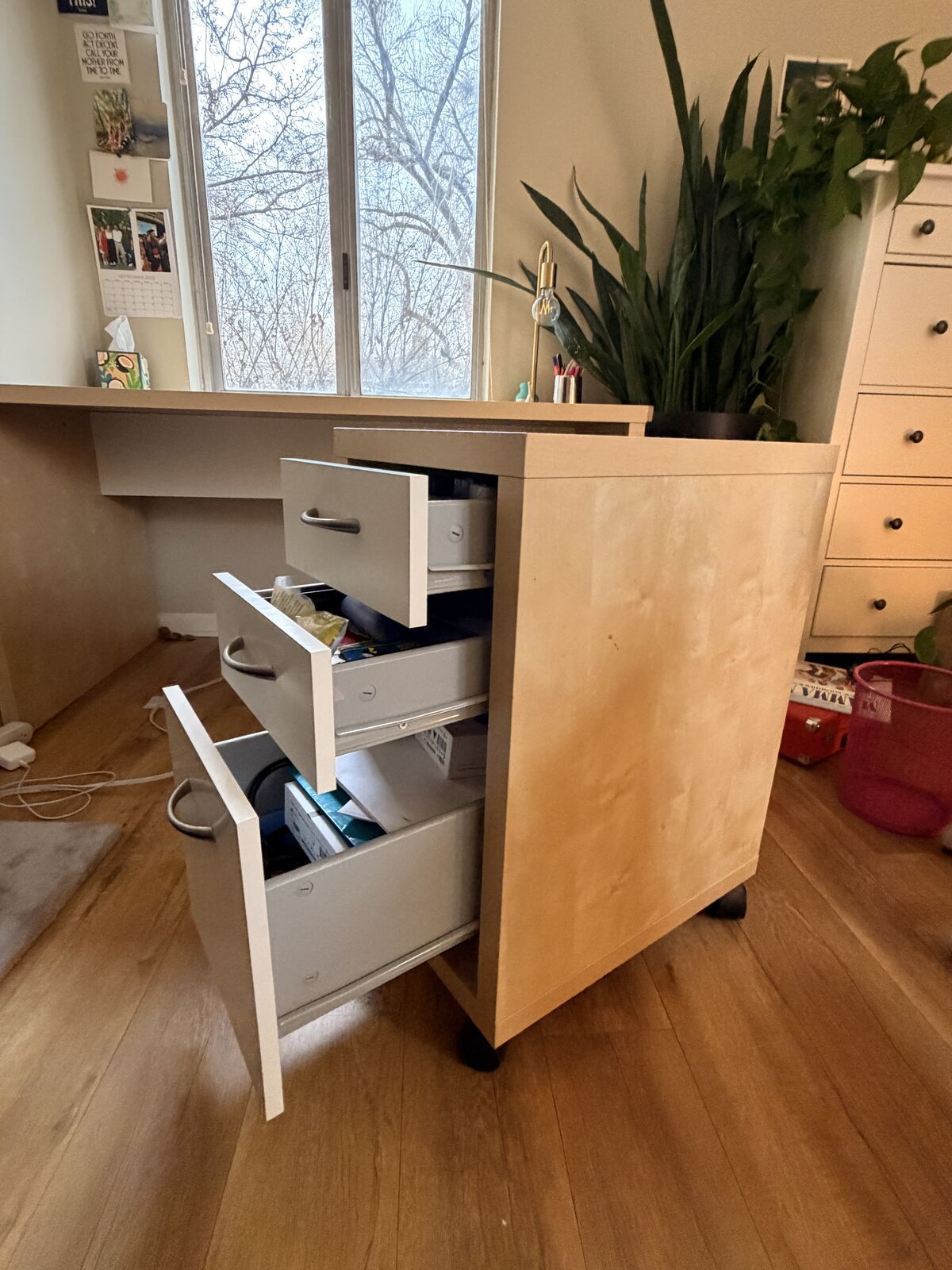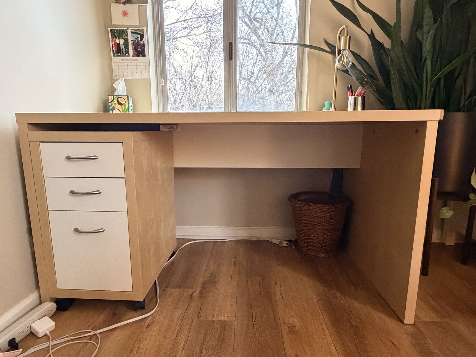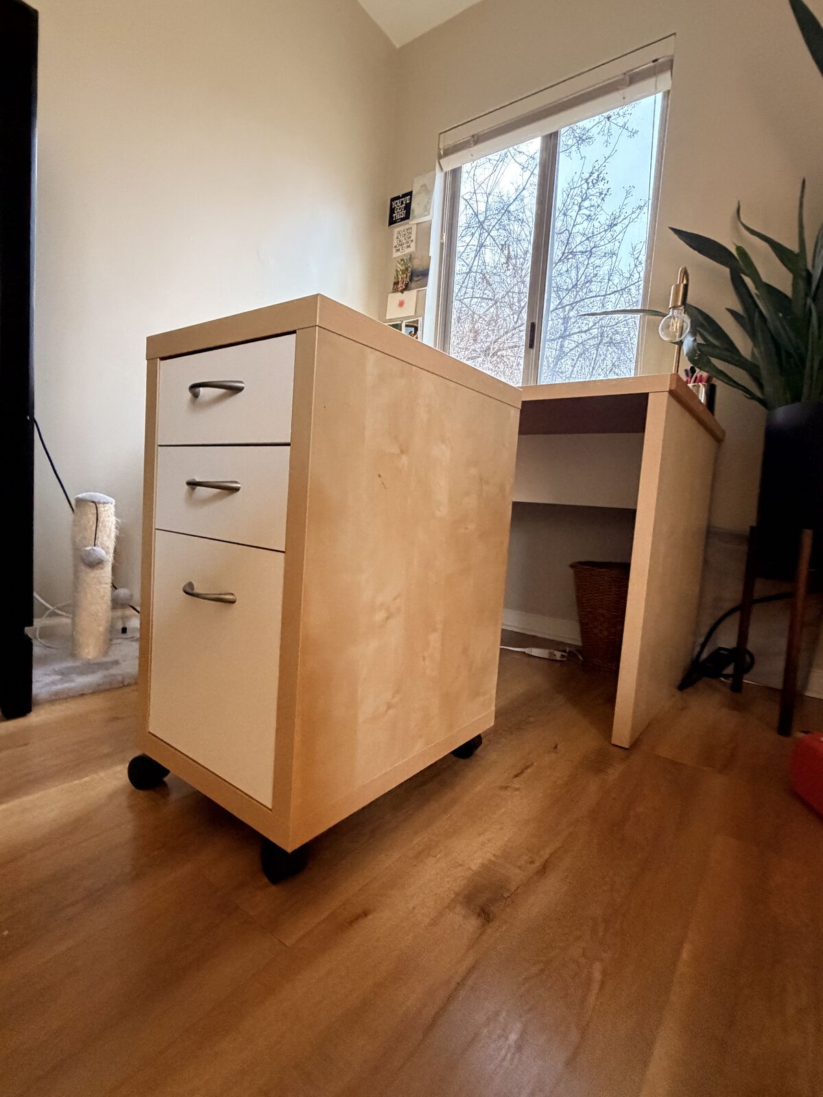 VenmoLike new Hemnes Ikea desk with pine finish and matching roller drawers. It is in excellent condition with a very small superficial scratch on the desk surface. Apart from the minor scratch, it is in perfect condition. Drawers provide excellent storage and are also in mint condition. Measurements are as follows: