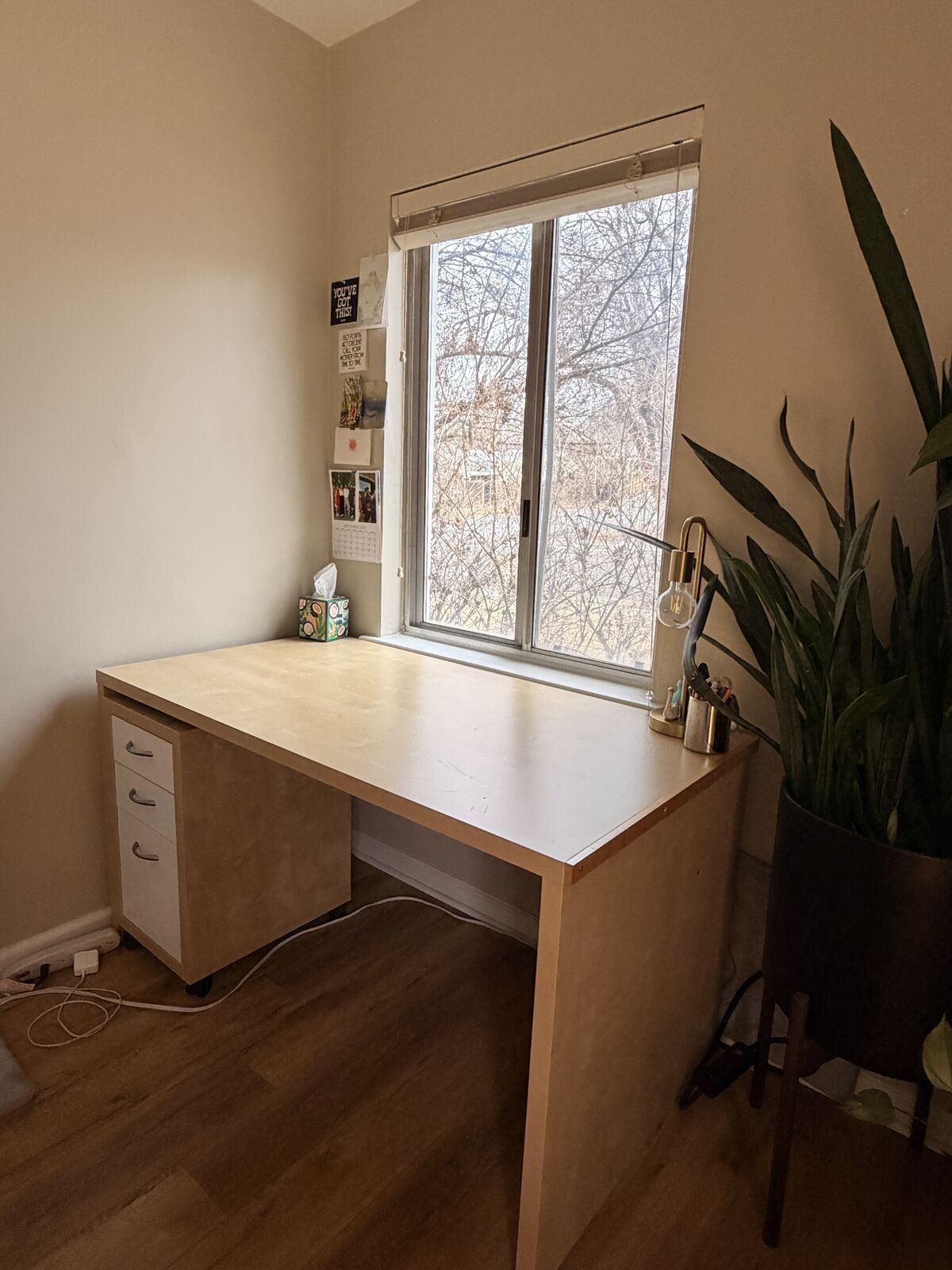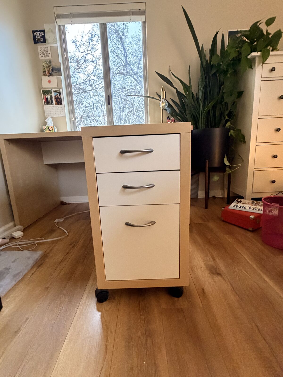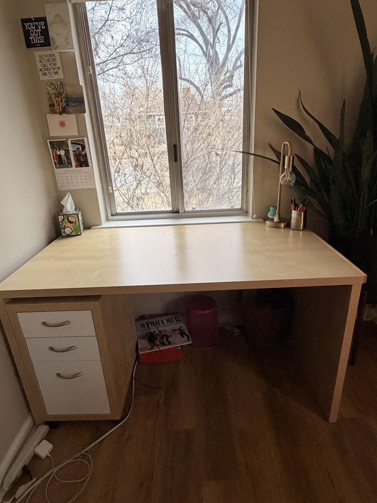 VenmoLike new Hemnes Ikea desk with pine finish and matching roller drawers. It is in excellent condition with a very small superficial scratch on the desk surface. Apart from the minor scratch, it is in perfect condition. Drawers provide excellent storage and are also in mint condition. Measurements are as follows: