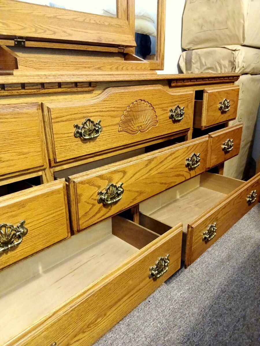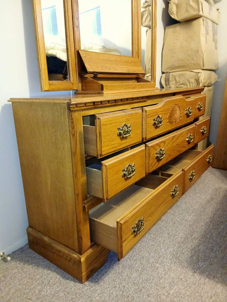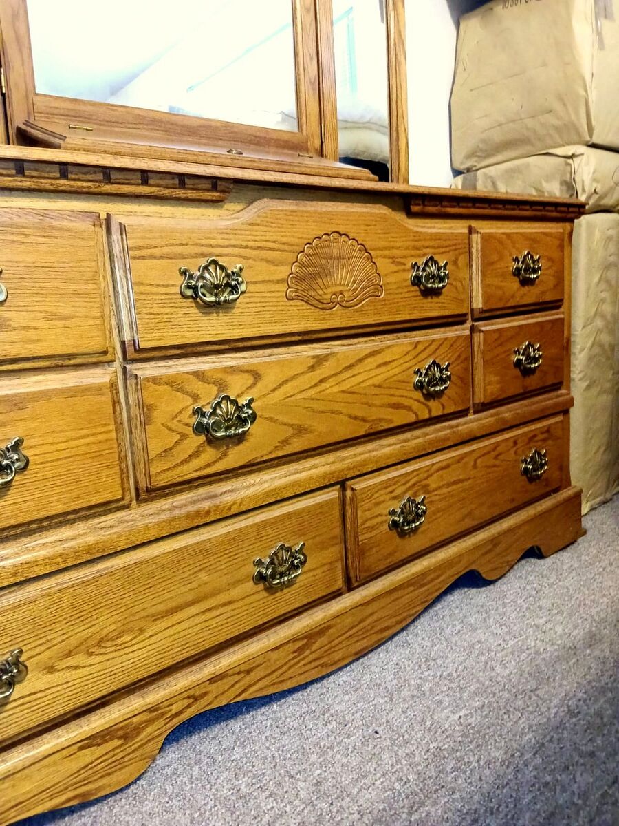 Beautiful solid oak dresser with matching mirror in a classic traditional style.