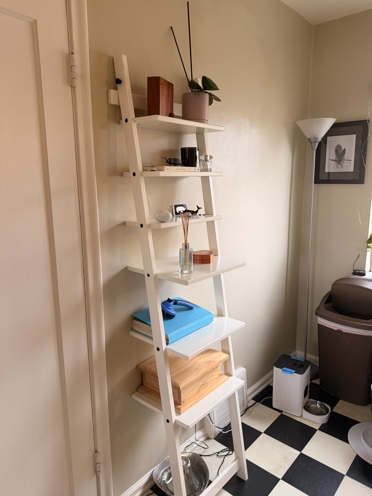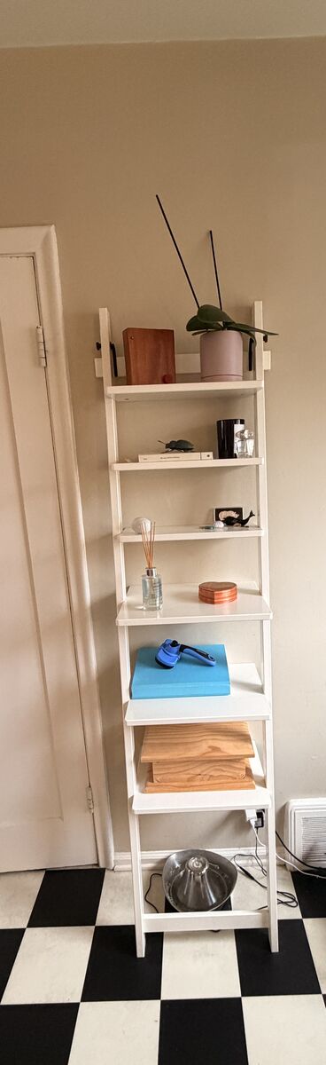 ApplePayLike new Ikea ladder shelf in white with black accents for sale! This is a great light weight piece to help display small to medium items in a stylish way. It has 3 small 8" shelves and 3 larger 13" shelves. It can be bolted to the wall as well to increase stability. Measurements are as follows:
