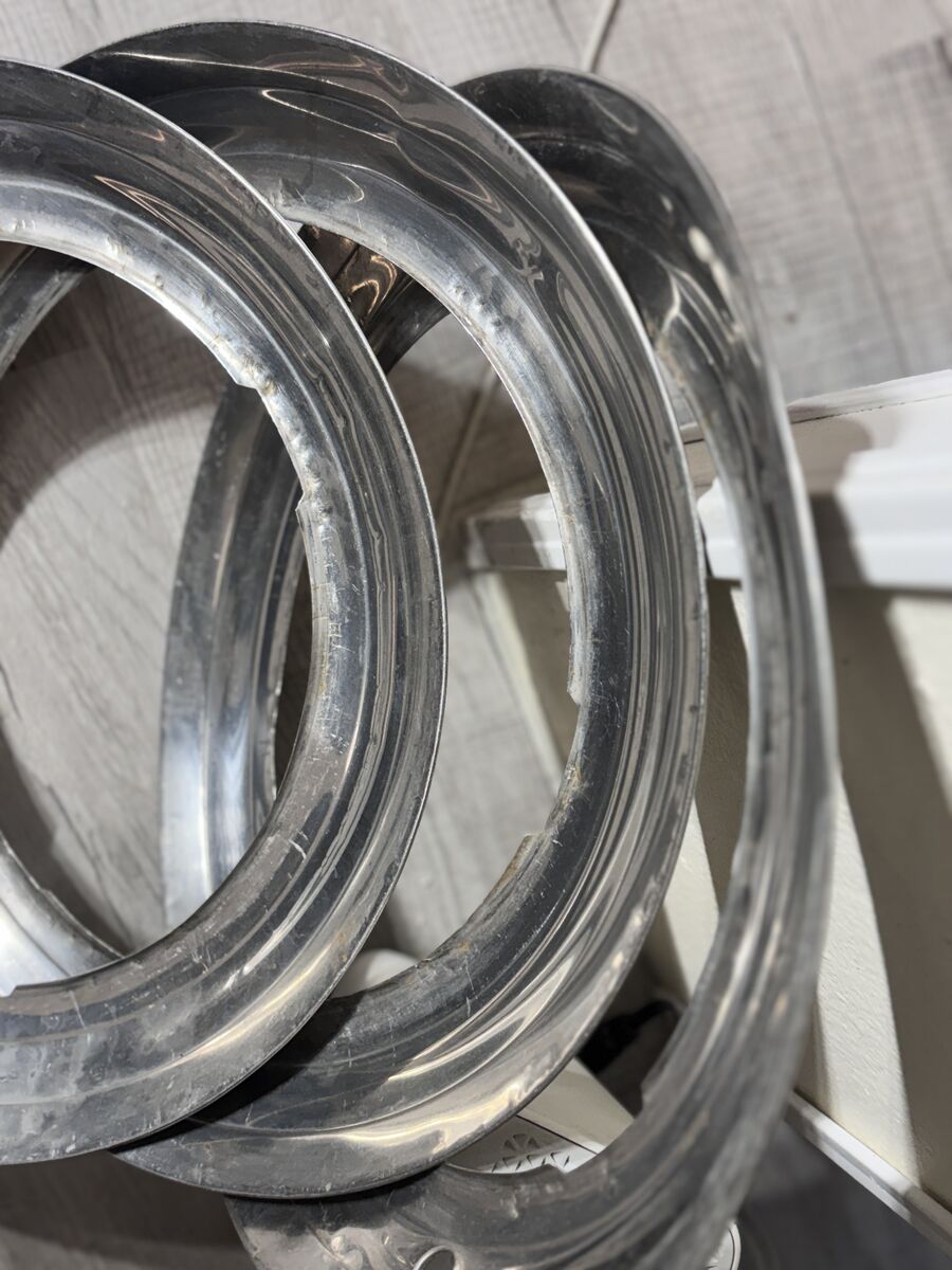 PayPal3 Stainless 15" Wheel Trim Rings for VW or Corvette Models 3 Piece Vintage Chrome. Some dents and slight dings. Gripper teeth around rim. Vintage. If interested please call or text Jamie at 385-471-4333. Thanks