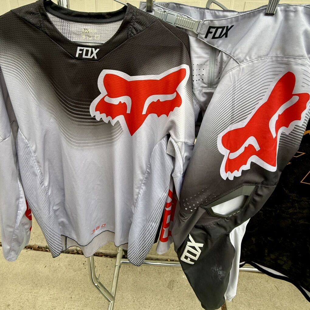 Fox moto pants, 36 waist. Fox jerseys, black one is XXL, grey is L.