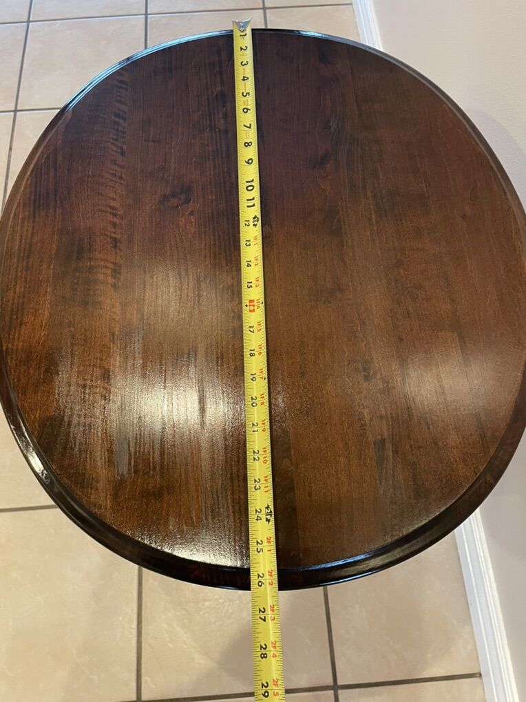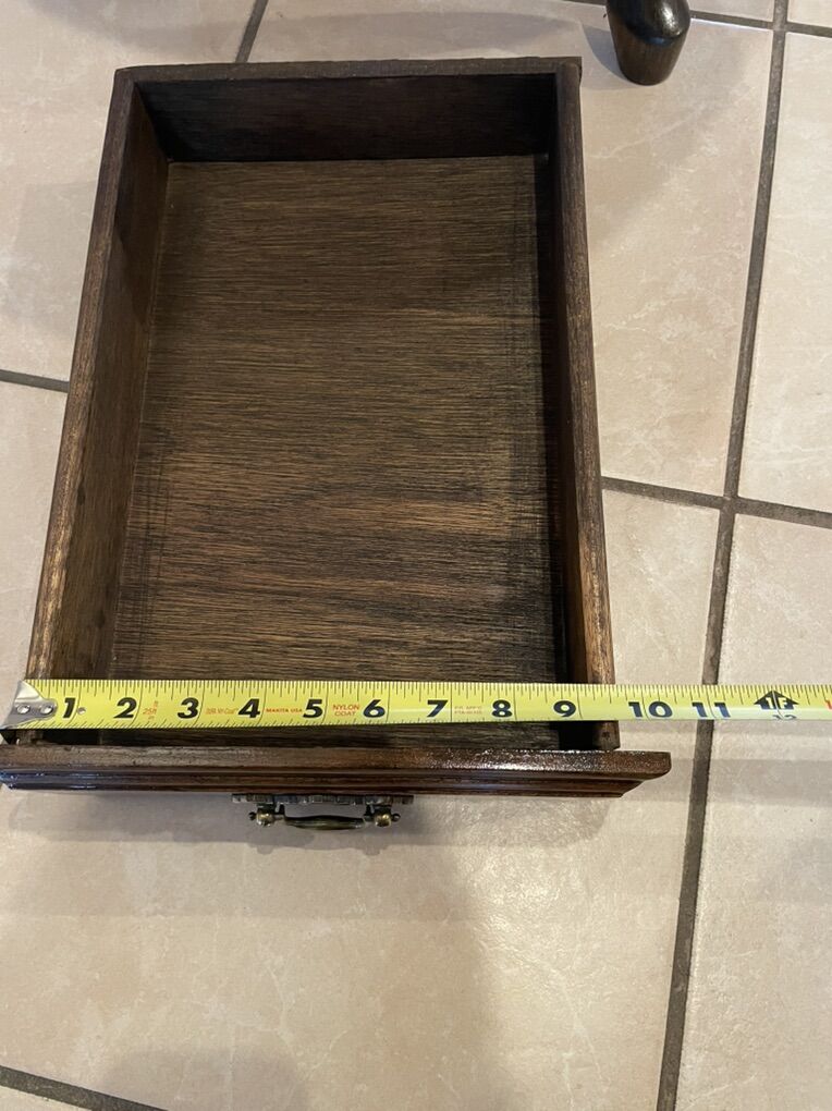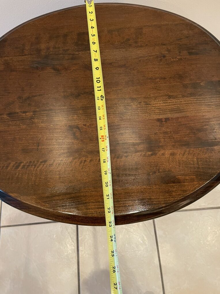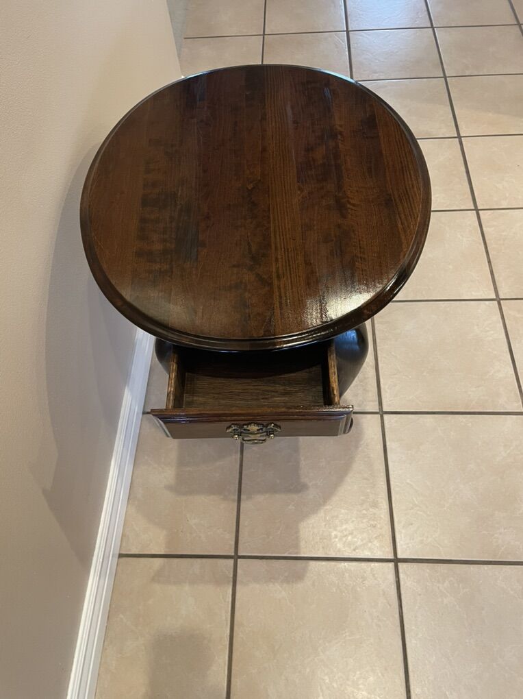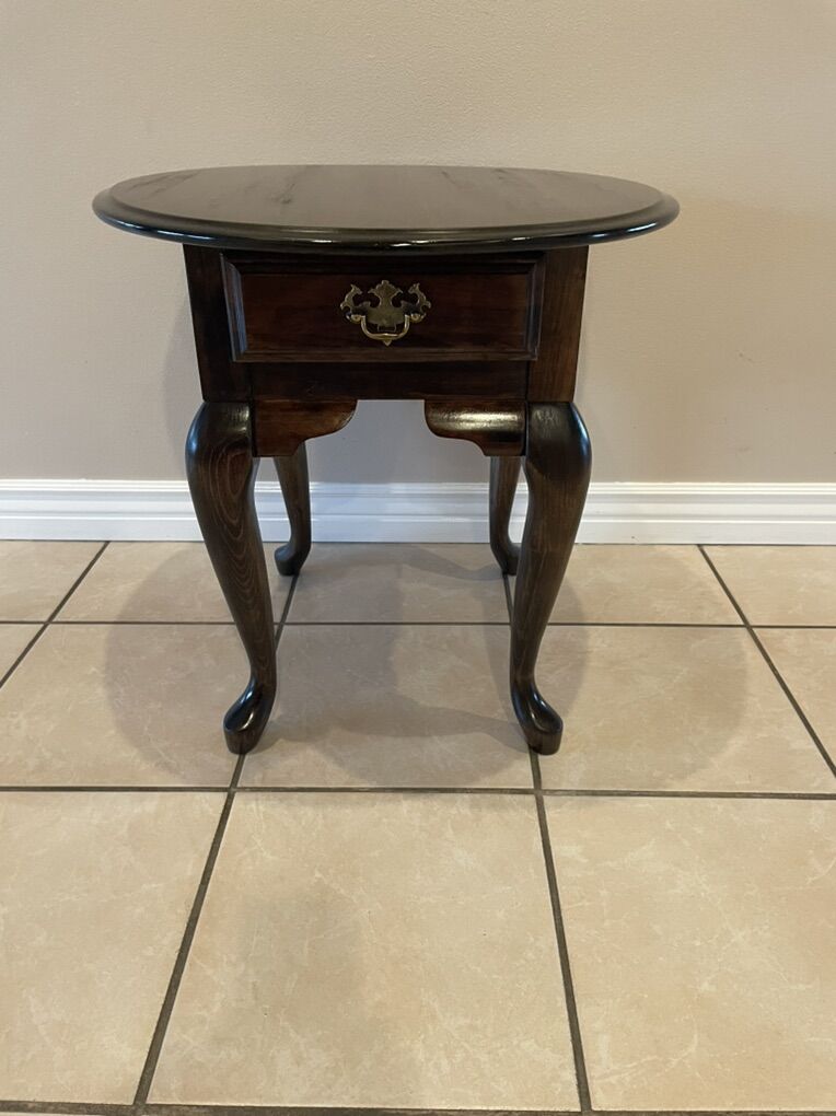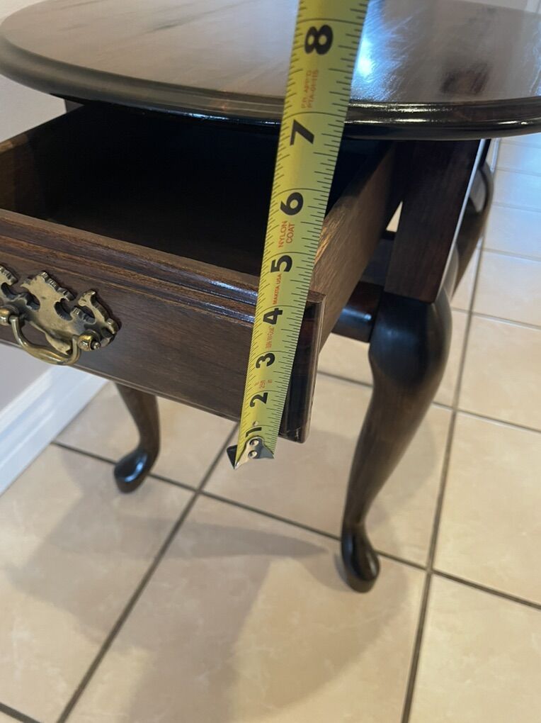 VenmoBeautiful end table in a dark walnut stain. This features stunning French type legs and a small drawer on one side. It is just under 24” high, 26” long and 23” wide. The face of the drawer is 11” long X 4” high and has a depth of 14”. The legs are very sturdy and held comfortably in place by strong bolts.
