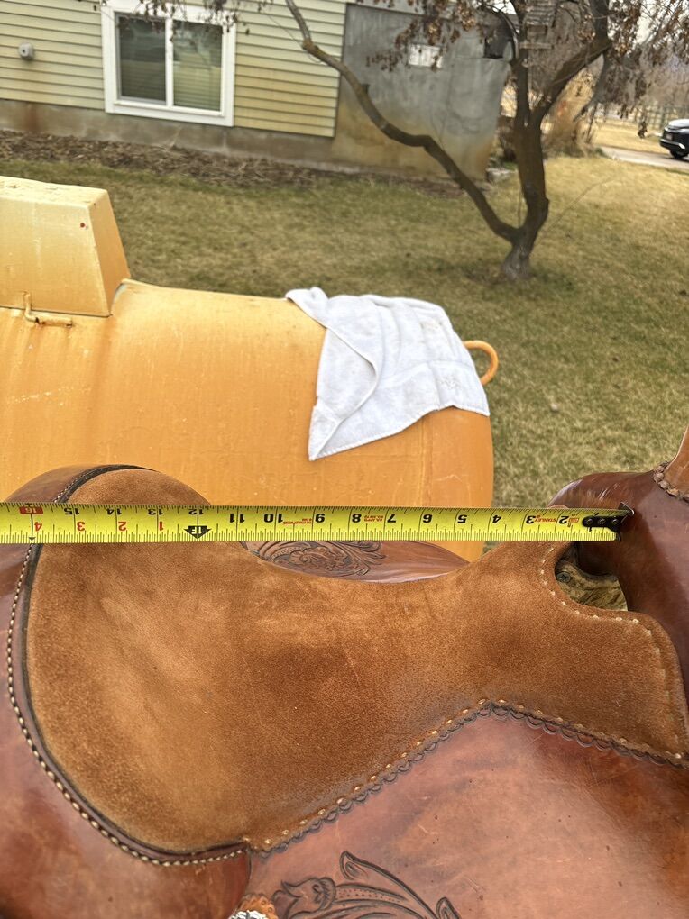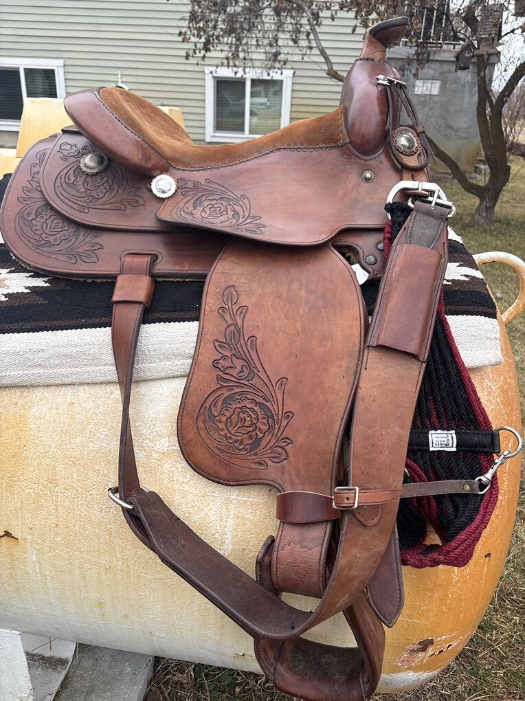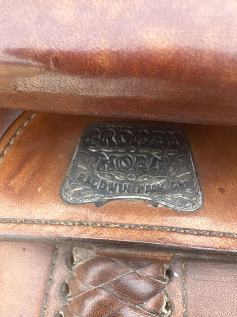 Hand made Broken Horn saddle from Baldwin Park California. This is a really nice made saddle from a great maker. Rawhide covered wood tree, real sheepskin quick change leather covered stirrups. Real silver and hand carved leather. Really well made. Located 7 miles south of Logan. 950.00. Check the maker out on Google.