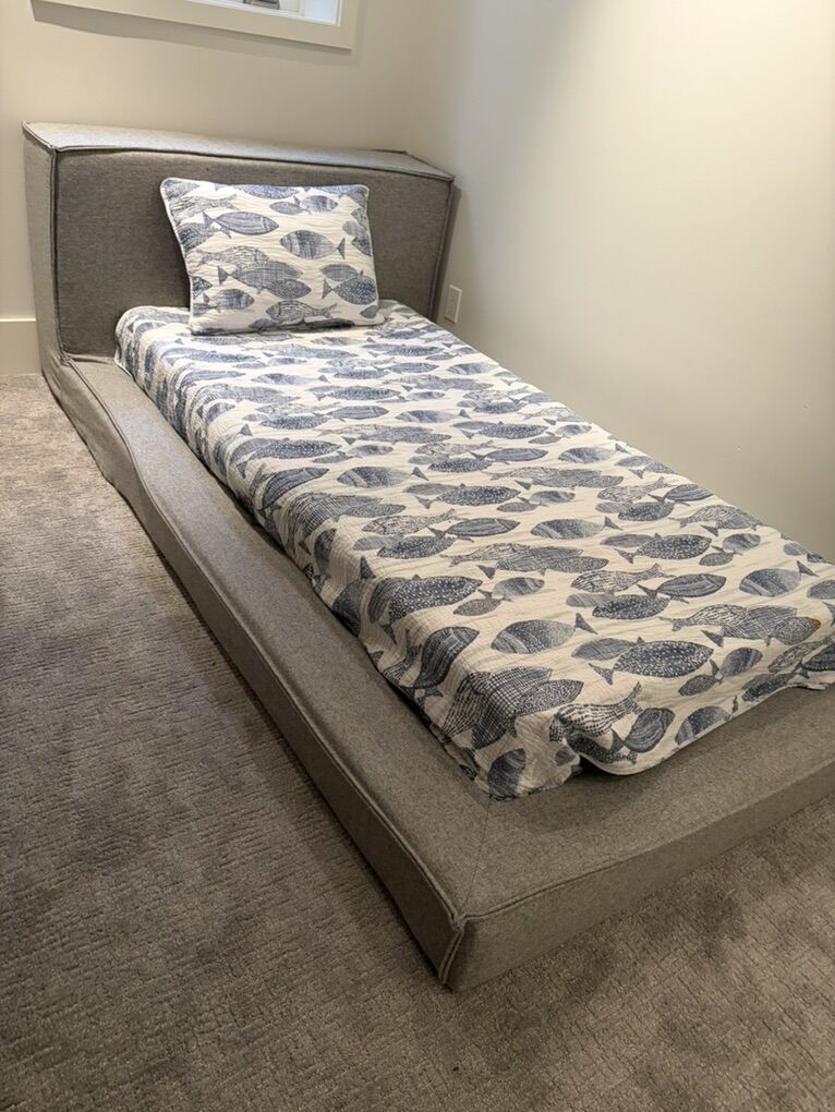 ApplePayTwin bed with modern upholstered platform frame and mattress. It comes apart for easy moving and storage. Clean, modern gray fabric with a low-profile design and built-in headboard.